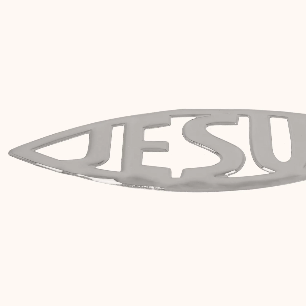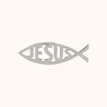 Symbol wiary w formie ryby z napisem JESUS. Wykonana z solidnego, metalizowanego tworzywa o połyskującym wykończeniu. Trwała, odporna na warunki atmosferyczne, idealna do oznaczenia samochodu, drzwi lub innej gładkiej powierzchni.