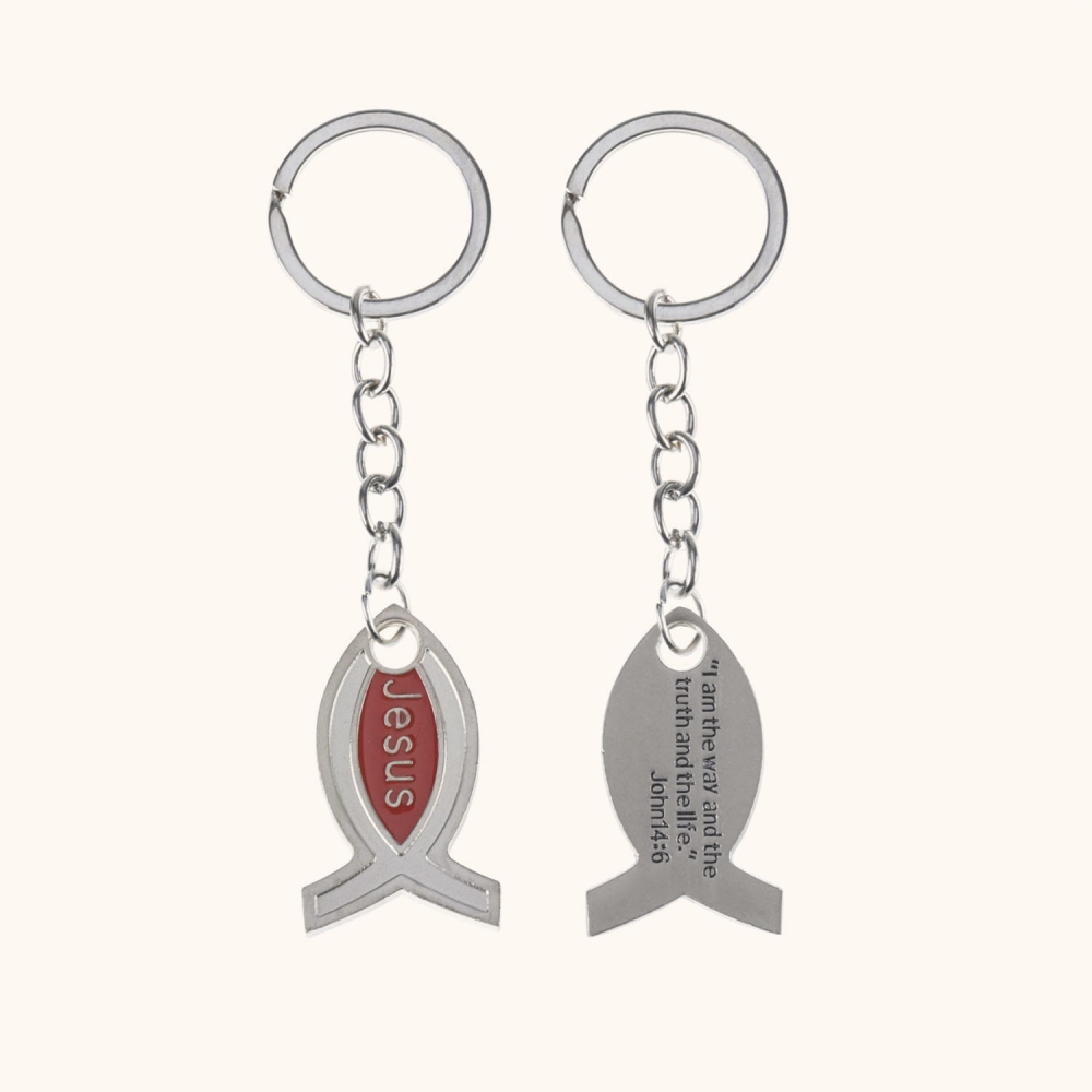 Metalowy brelok w kształcie symbolu Ichthys - znaku pierwszych chrześcijan. Z jednej strony widnieje napis JESUS, a z drugiej cytat z Ewangelii św. Jana: „I am the way and the truth and the life.” (J 14,6). Subtelny, trwały i pełen znaczenia dodatek do kluczy lub torby - prosty znak wiary noszony na co dzień.