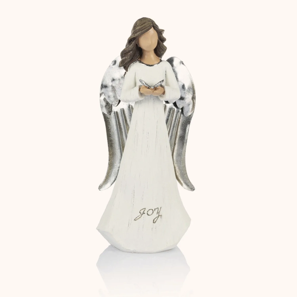 Delikatne, srebrzyste skrzydła i napis JOY u podstawy przypominają o radości płynącej z pokoju i dobra. Idealna jako ozdoba świąteczna lub prezent pełen ciepła.