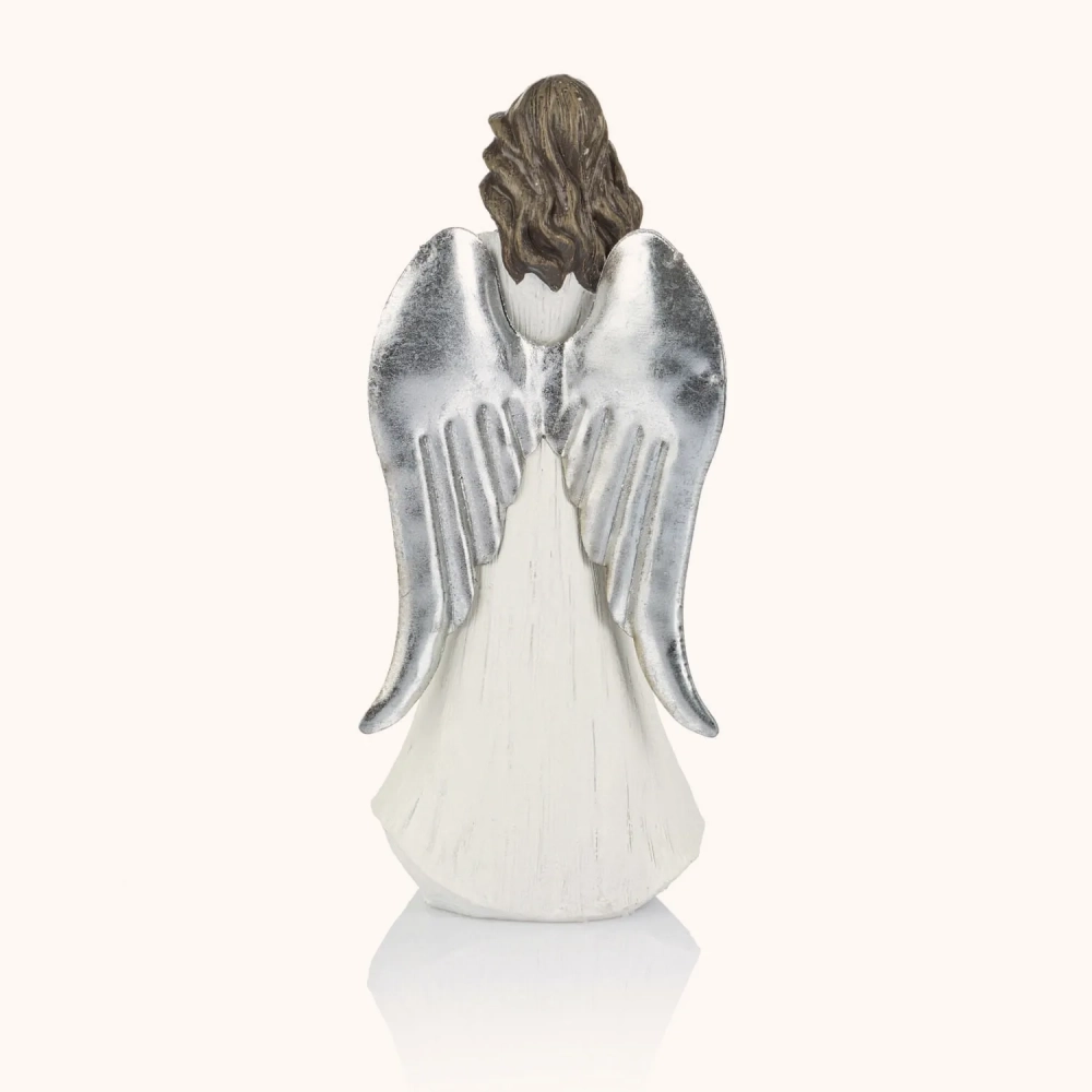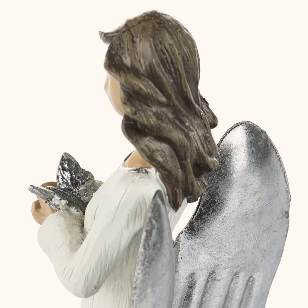 Subtelna figurka anioła o wysokości 20 cm, trzymającego w dłoniach motyla - symbol przemiany i nadziei.