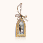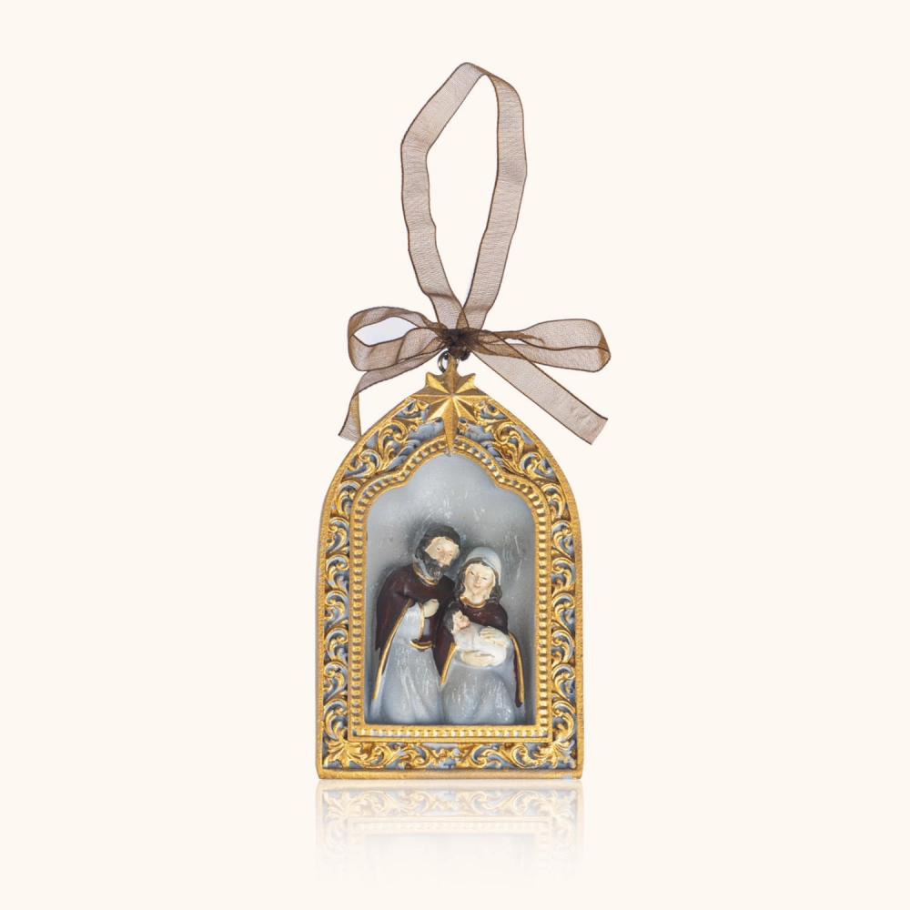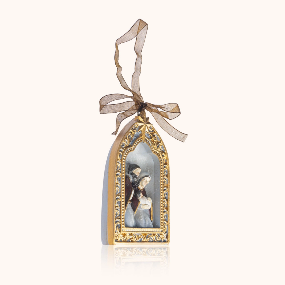 Zawieszka z wizerunkiem Świętej Rodziny, misternie otoczona złotą ramą i delikatną wstążką, przywołuje ciszę betlejemskiej nocy. Niewielka forma - 10 cm wysokości - sprawia, że stanie się subtelną ozdobą choinki, wieńca lub wnętrza, niosąc w sercu przesłanie bliskości i pokoju.