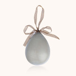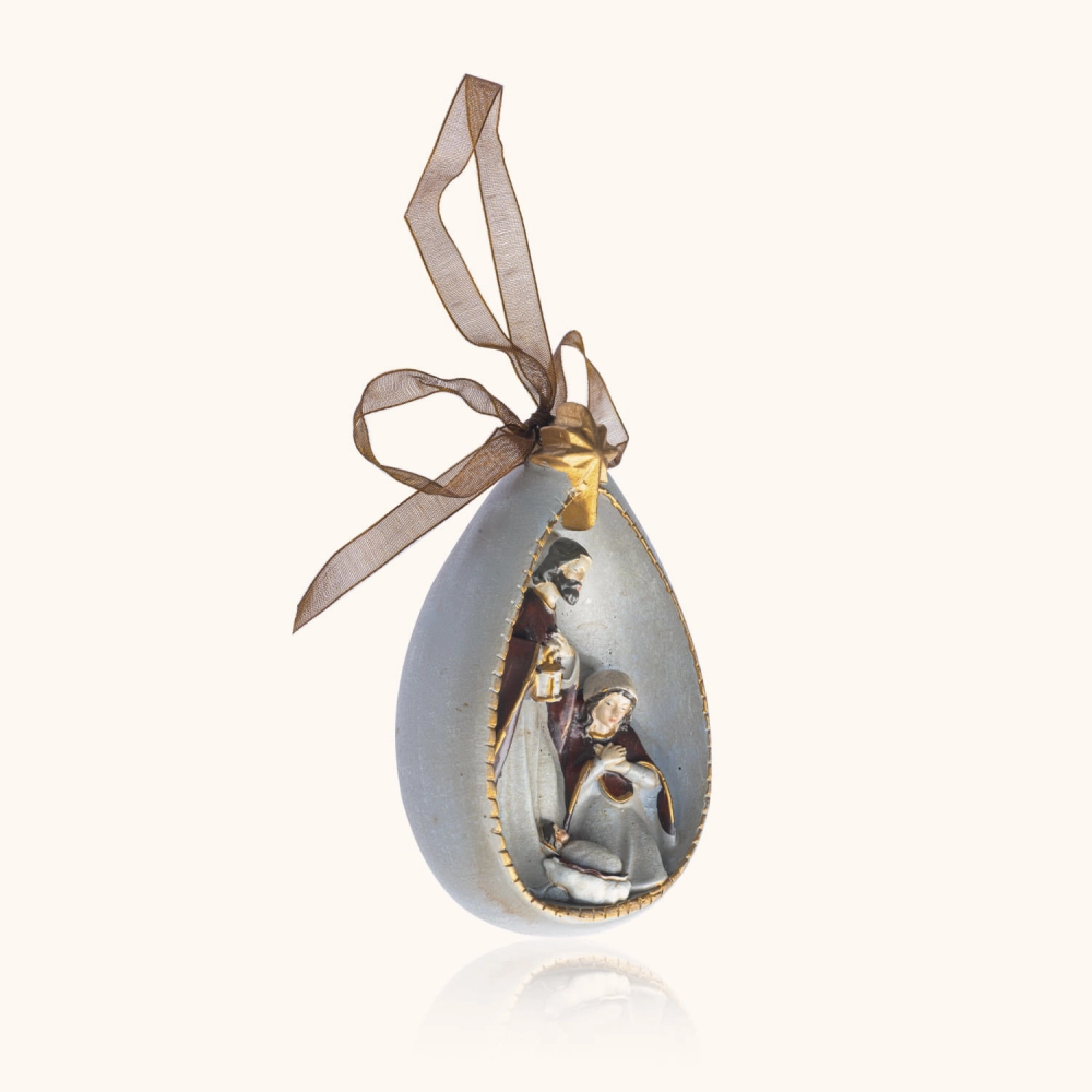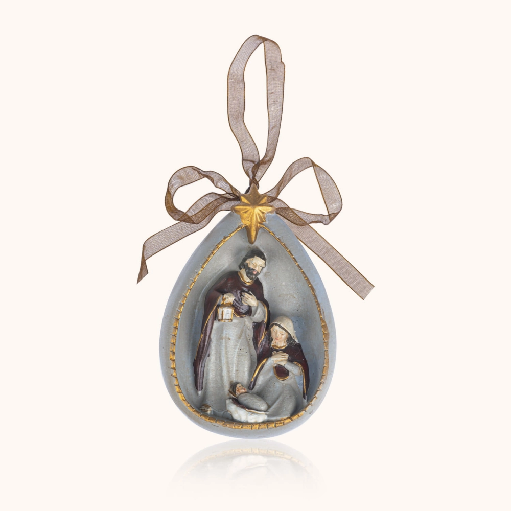 Zawieszka w kształcie kropli otula Świętą Rodzinę jak łza wzruszenia lub kropla łaski. Delikatne złocenia i kokarda sprawiają, że może zawisnąć na choince, w oknie lub nad stołem – cicho przypominając o cudzie, który wydarzył się w Betlejem.