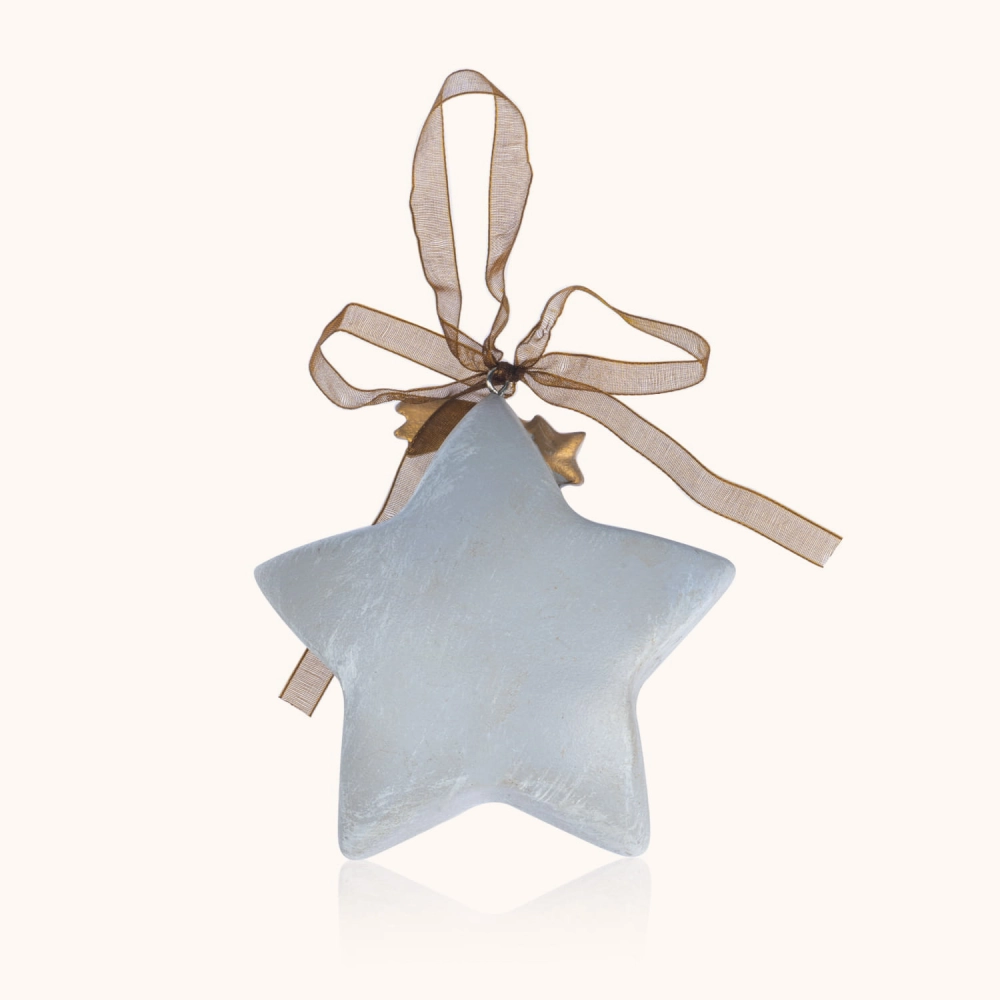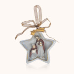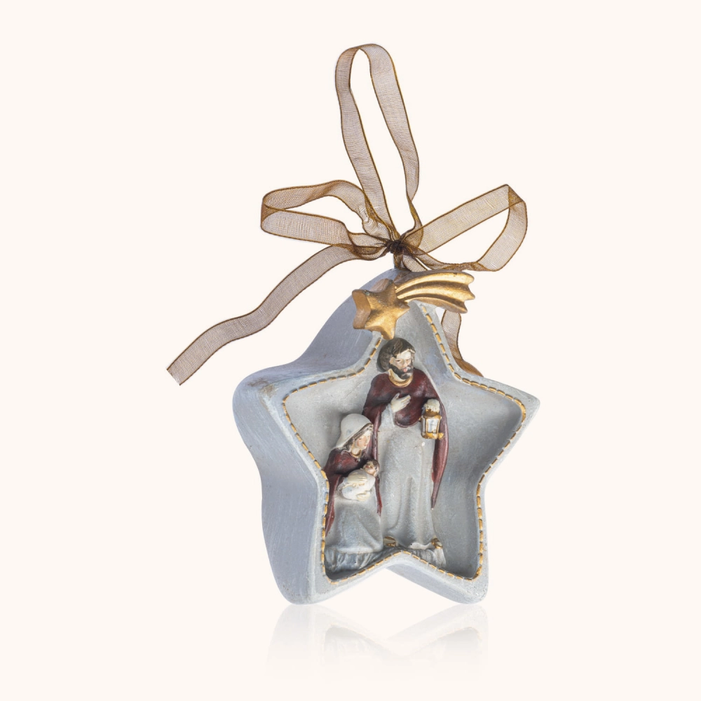 Niewielka zawieszka w kształcie gwiazdy kryje w sobie cichą obecność Świętej Rodziny. Utrzymana w delikatnych, pastelowych barwach, ozdobiona wstążką i złotą gwiazdą betlejemską – idealna, by wprowadzić symboliczny akcent wiary do świątecznego drzewka.