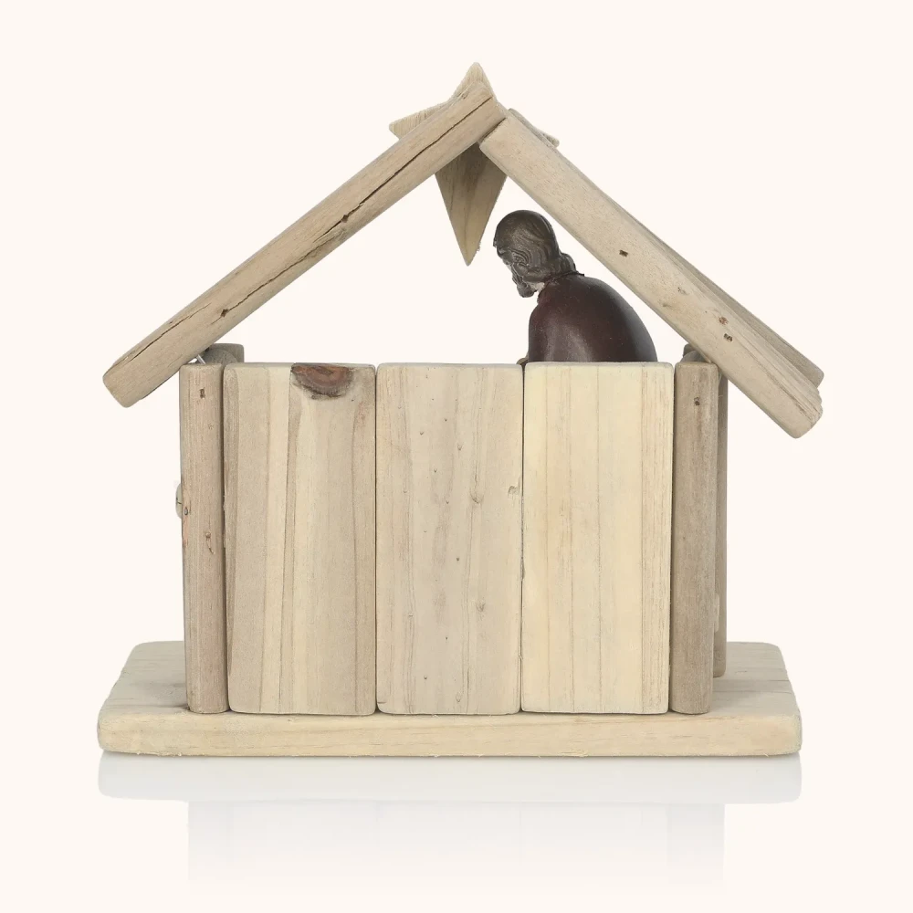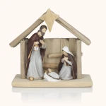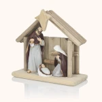 Figurka o wysokości 18 cm przedstawiająca Świętą Rodzinę w drewnianej stajence z gwiazdą betlejemską. Wykonana z połączenia żywicy i drewna, w naturalnych, ciepłych kolorach. Stabilna i estetyczna - idealna do postawienia na stole, komodzie lub pod choinką.