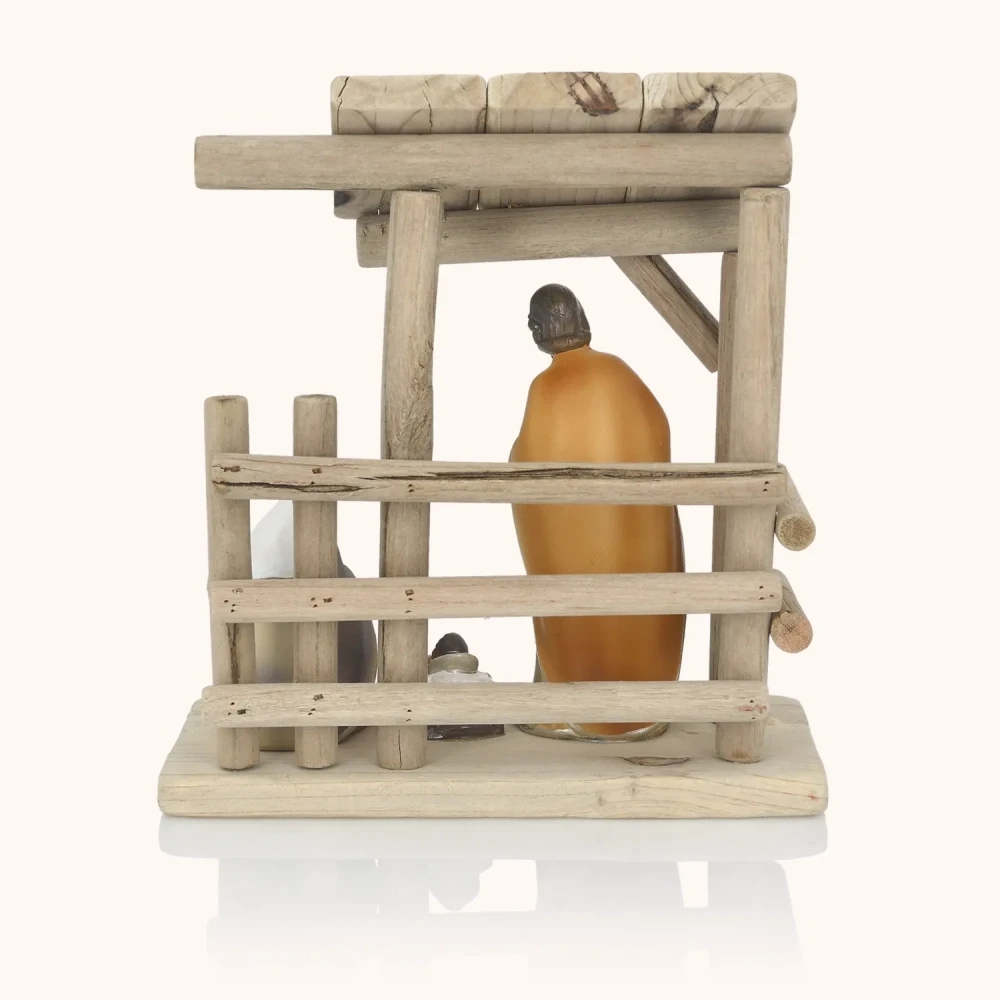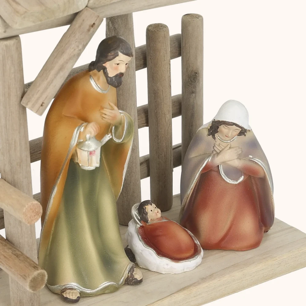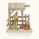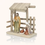 Dekoracyjna szopka o wysokości 20 cm wykonana z drewna i żywicy. Przedstawia Świętą Rodzinę w prostej stajence z naturalnym wykończeniem. Starannie odwzorowane postacie i delikatne kolory nadają całości ciepły, tradycyjny charakter. Idealna do świątecznych aranżacji lub jako prezent.
