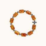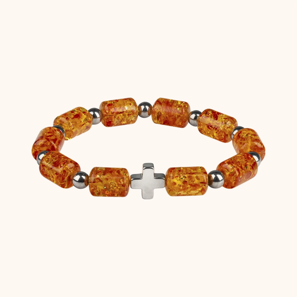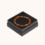 Elastyczna bransoletka wykonana z bursztynu syntetycznego w odcieniach brązu, połączonego z hematytem i elementami metalowymi. Koraliki o średnicy 14 mm. Solidna i wygodna, dobrze układa się na nadgarstku.