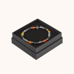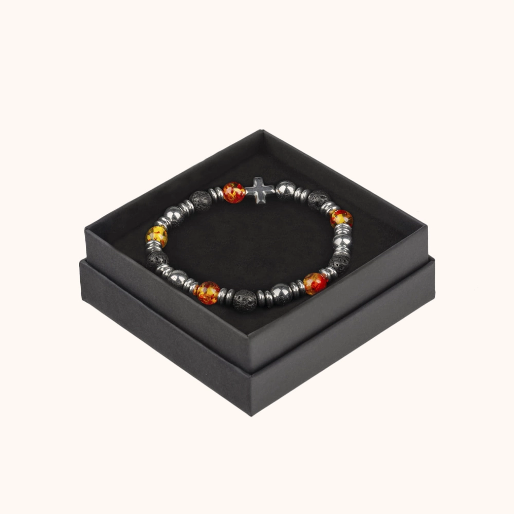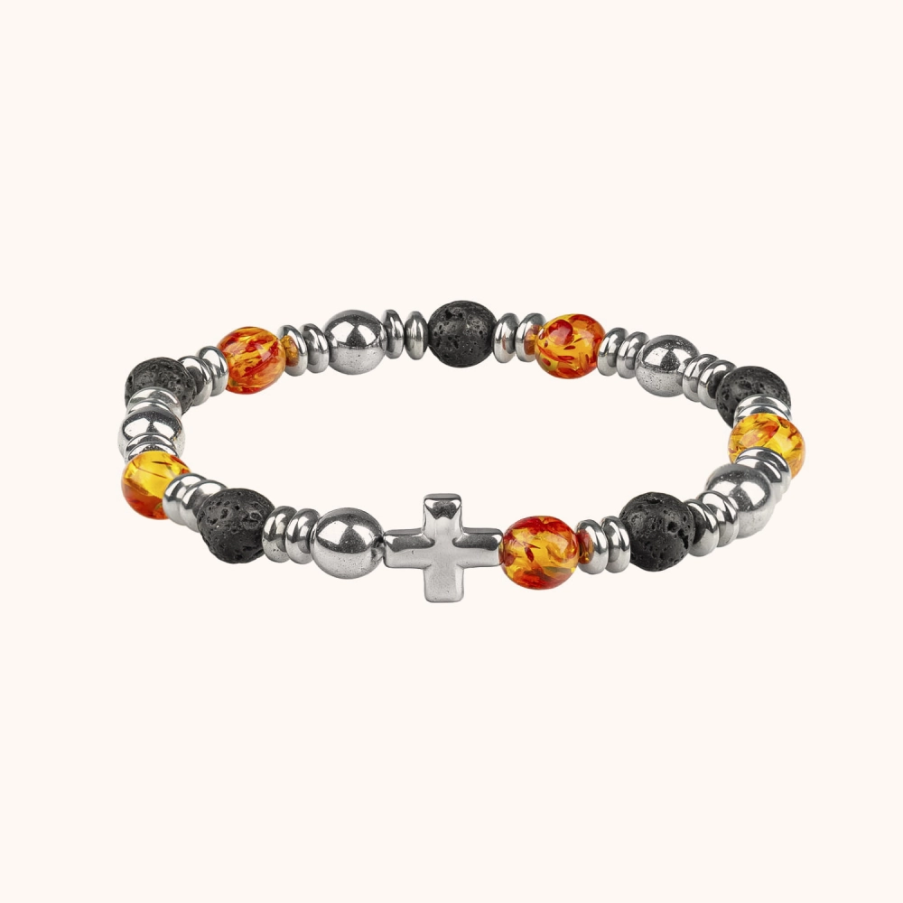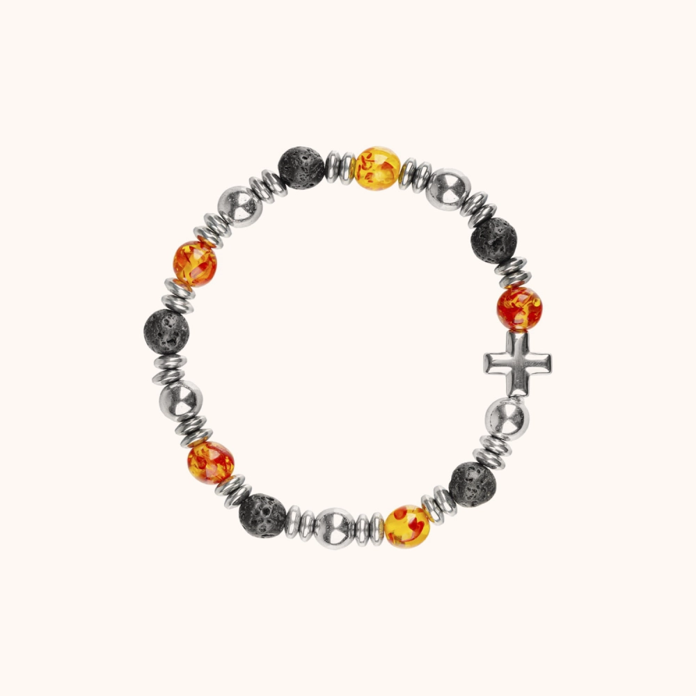 Bransoletka różańcowa wykonana z połączenia bursztynu syntetycznego, hematytu i lawy wulkanicznej, nawleczona na elastyczną gumkę. Różnorodne faktury i kolory koralików tworzą nowoczesną, a zarazem symboliczną kompozycję. Produkt zapakowany w eleganckie pudełko prezentowe.