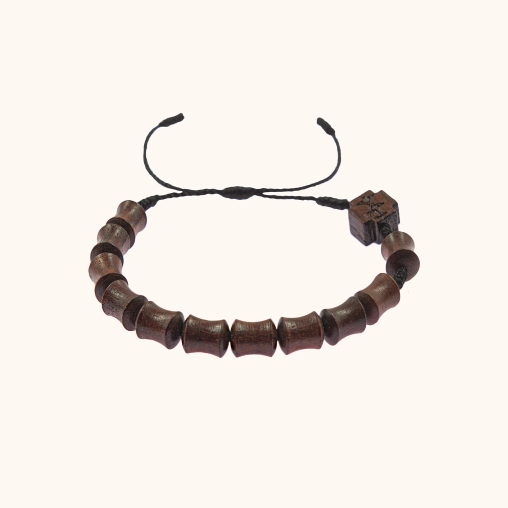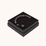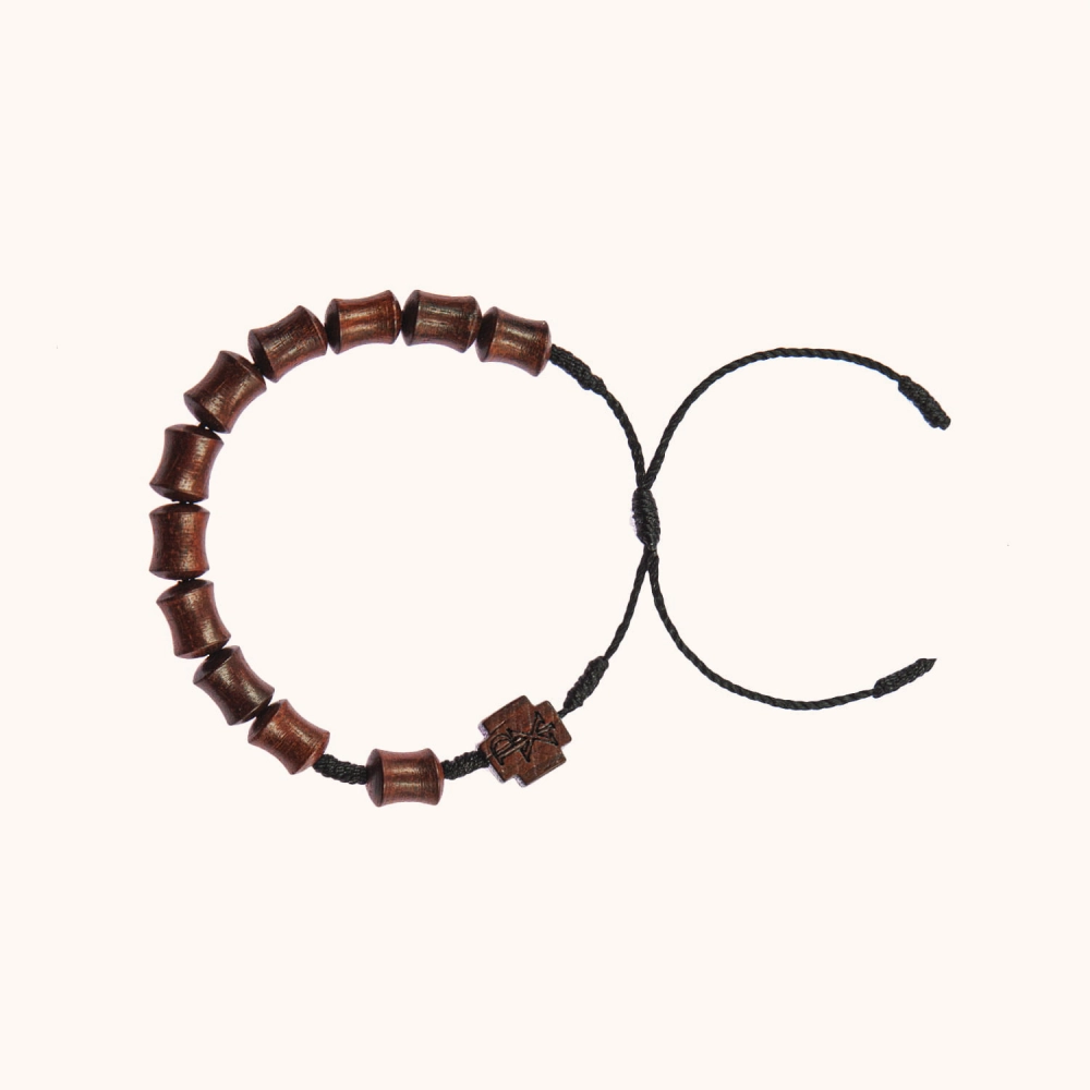 Bransoletka różańcowa wykonana z drewna palisandru mukulskiego, nawleczona na czarny sznurek z możliwością regulacji. Składa się z jedenastu koralików oraz drewnianego krzyżyka. Produkt zapakowany w dekoracyjne pudełko.