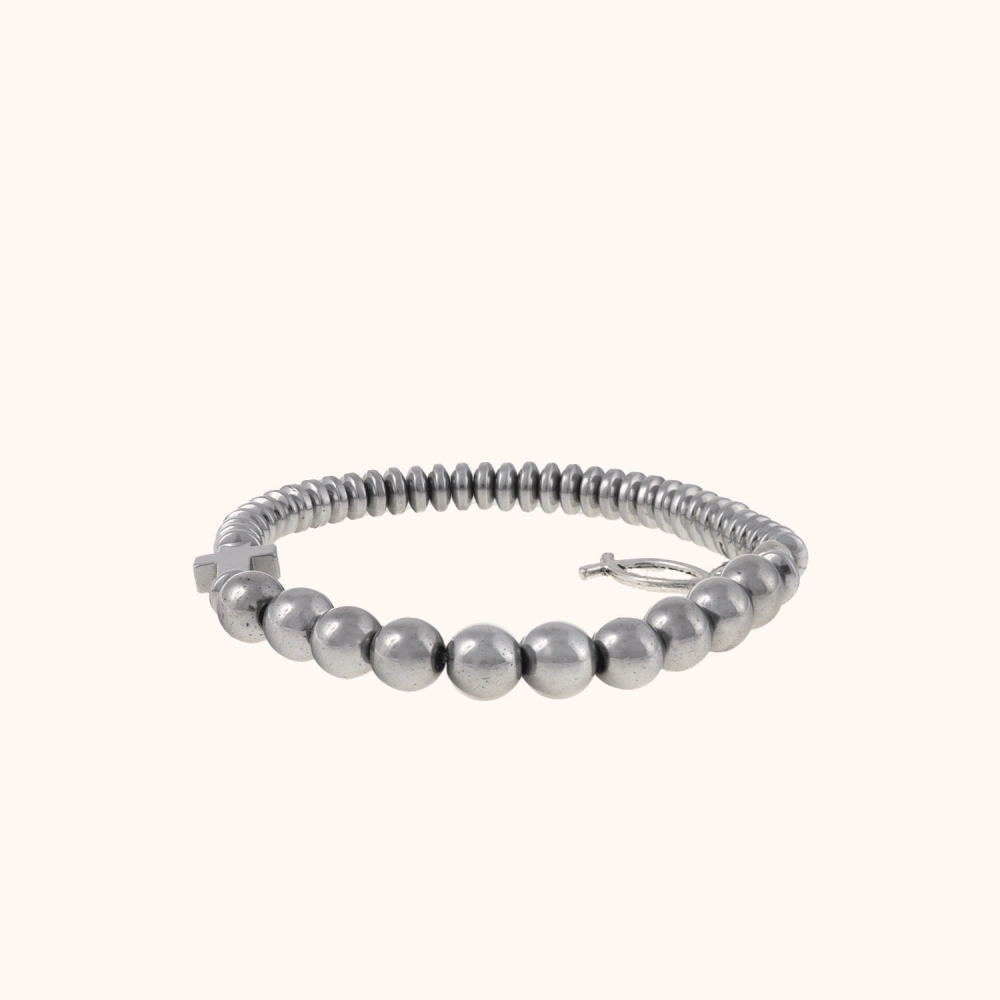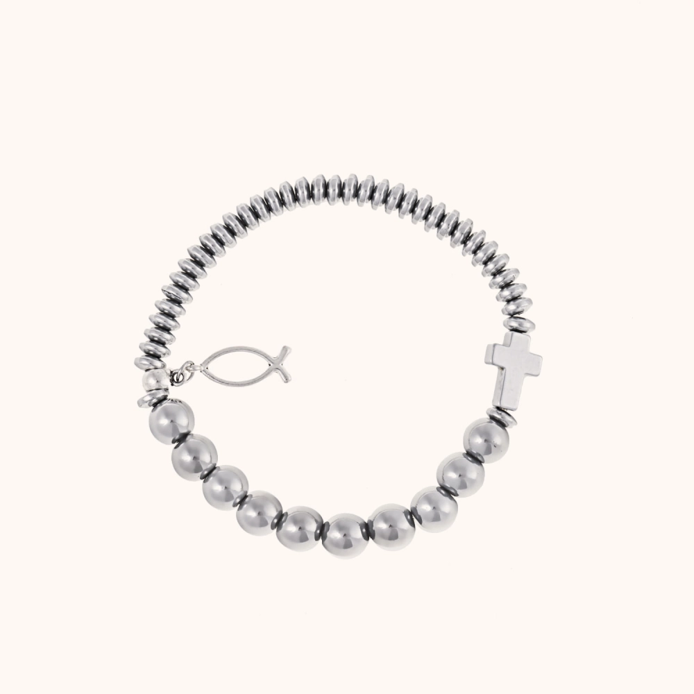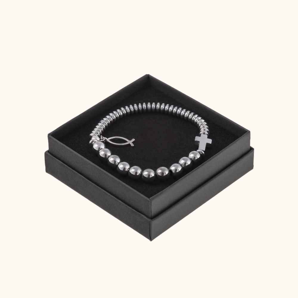 Bransoletka męska z hematytu w formie dziesiątka różańca wykonana z elastycznego sznurka i dwóch rodzajów koralików o średnicy 8 i 4 mm. Dzięki swojej formie umożliwia wygodne noszenie i codzienne odmawianie modlitwy. Produkt zapakowany w eleganckie pudełko prezentowe.
