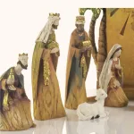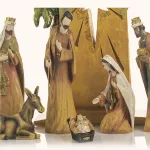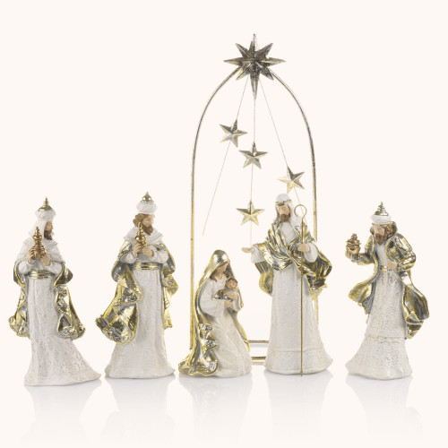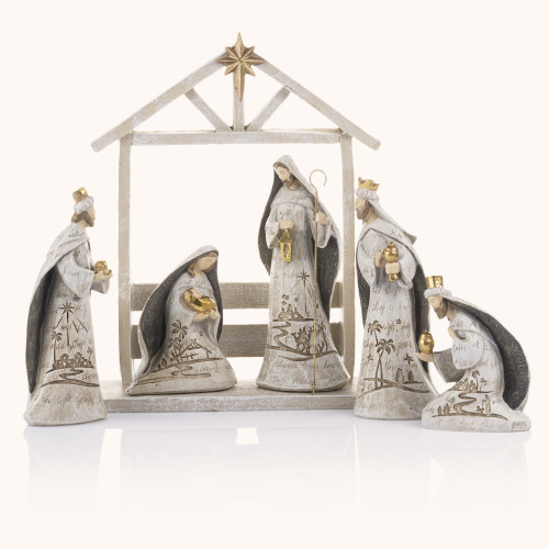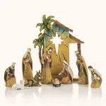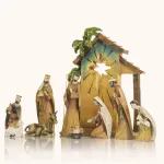 Szopka bożonarodzeniowa w ciepłych, naturalnych barwach z subtelnym blaskiem gwiazdy betlejemskiej. Delikatne figury tworzą harmonijną i pełną pokoju scenę Narodzenia. W formie o wysokości około 30 cm stanowi elegancką ozdobę, która wnosi do wnętrza światło i spokój Świąt.