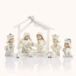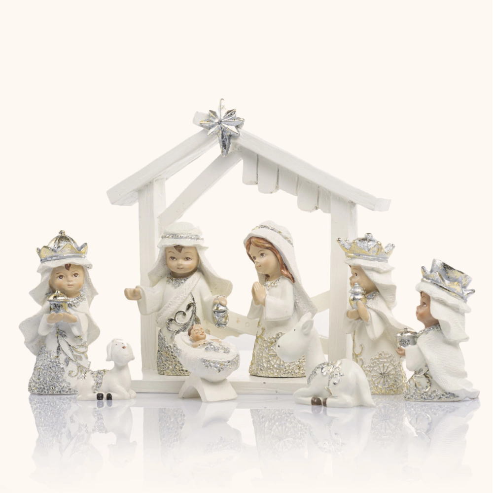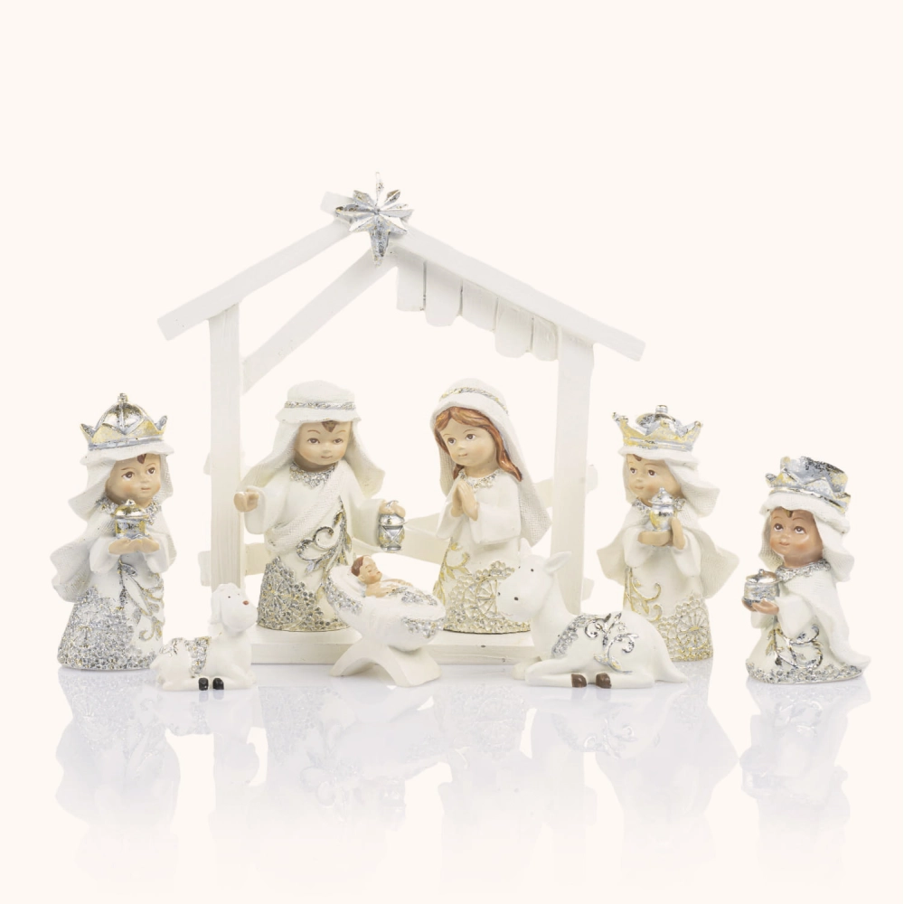 Szopka bożonarodzeniowa w dziecięcej odsłonie, utrzymana w jasnych, perłowych barwach ze złotymi akcentami. Uśmiechnięte postacie tworzą radosną scenę Narodzenia. W formie o wysokości około 16 cm stanowi uroczą ozdobę, która wprowadza do wnętrza ciepło i niewinność Świąt.