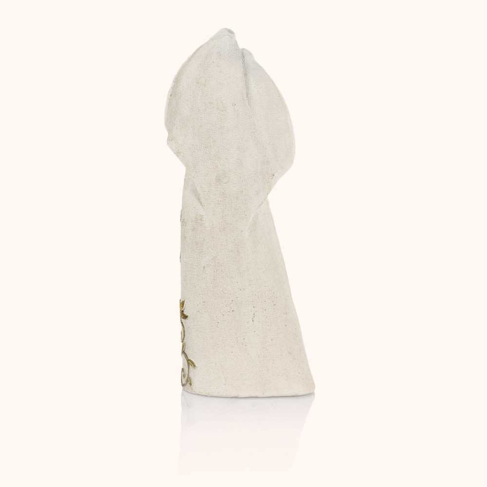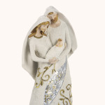 Figurka Świętej Rodziny w odcieniach bieli i złota, ozdobiona misternym wzorem symbolizującym blask nad Betlejem. Subtelna forma o wysokości około 24 cm emanuje ciepłem i spokojem, wnosząc do wnętrza elegancję i duchowe piękno Świąt.