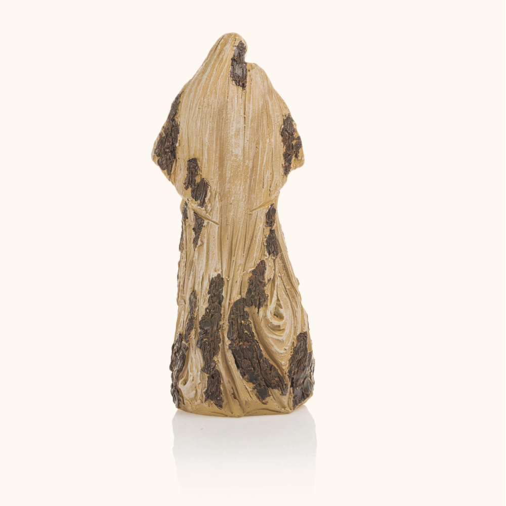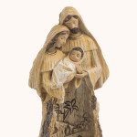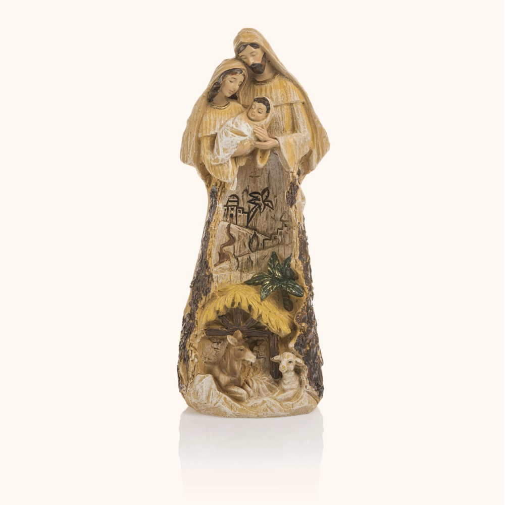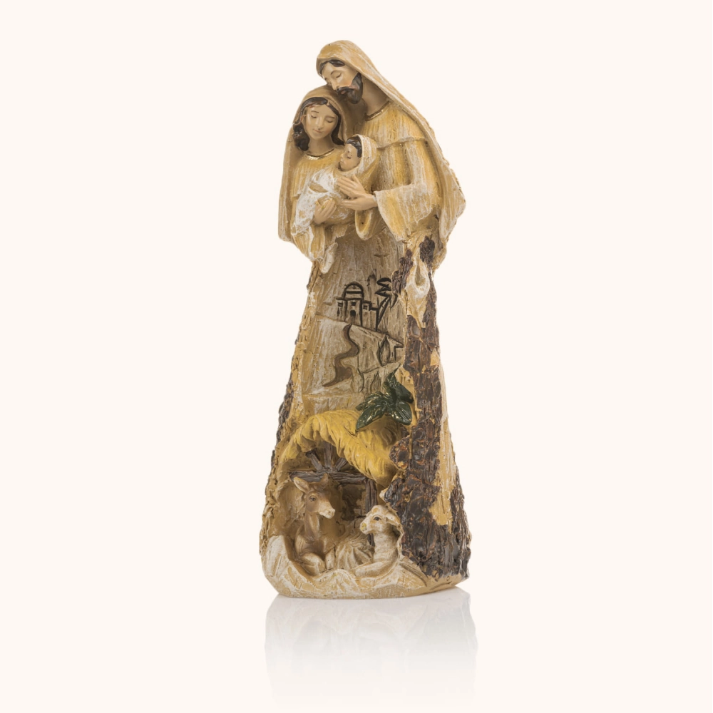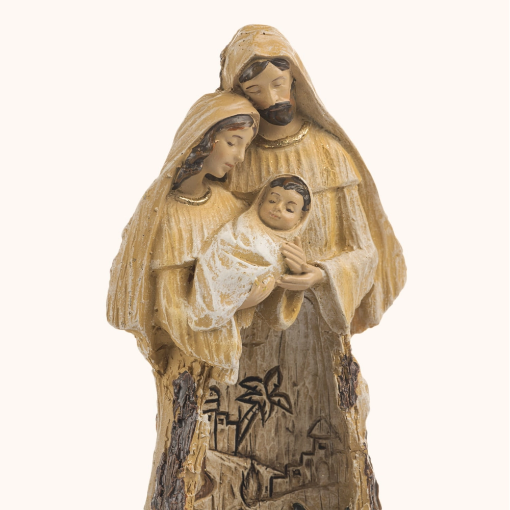 Figurka Świętej Rodziny w drewnianej oprawie, utrzymana w ciepłych, naturalnych tonach. Subtelne zdobienia i delikatne złocenia nadają jej wyjątkowego uroku. W formie o wysokości około 29 cm stanowi elegancką ozdobę, która wprowadza do wnętrza spokój i ciepło Świąt.