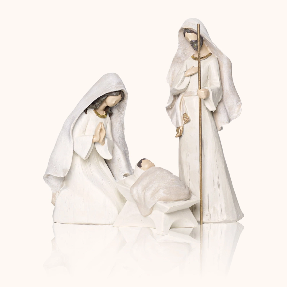 Figurka Świętej Rodziny w odcieniach bieli i złamanej perły zachwyca prostotą i spokojem. Delikatne linie i subtelne detale tworzą harmonijną scenę Narodzenia. W formie o wysokości około 41 cm stanowi elegancką ozdobę, która wnosi do wnętrza ciszę i duchowe piękno.