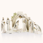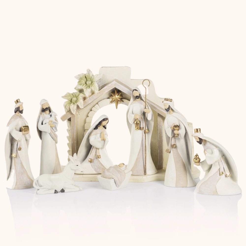 Szopka bożonarodzeniowa „Betlejemska Opowieść” w odcieniach bieli i złota, pełna subtelności i blasku. Delikatne postacie tworzą harmonijną scenę Narodzenia. W formie o wysokości około 20 cm stanowi elegancką ozdobę, która wprowadza do wnętrza ciepło i ciszę Świąt.