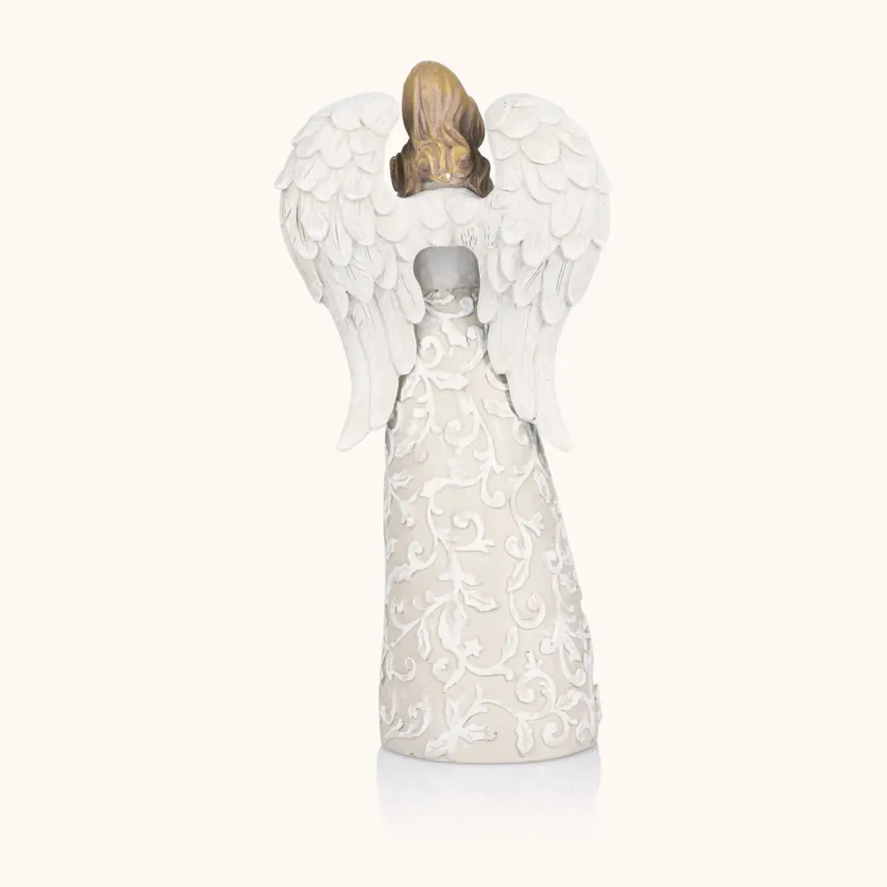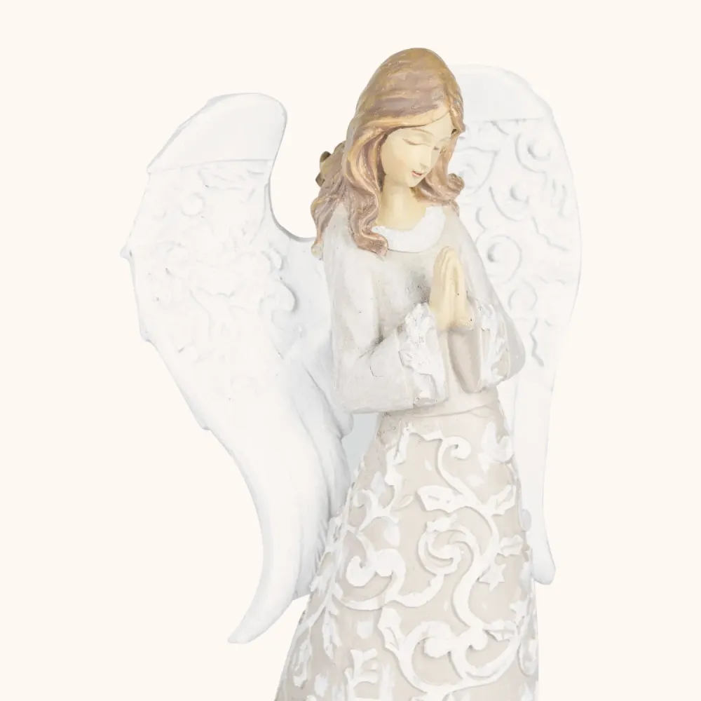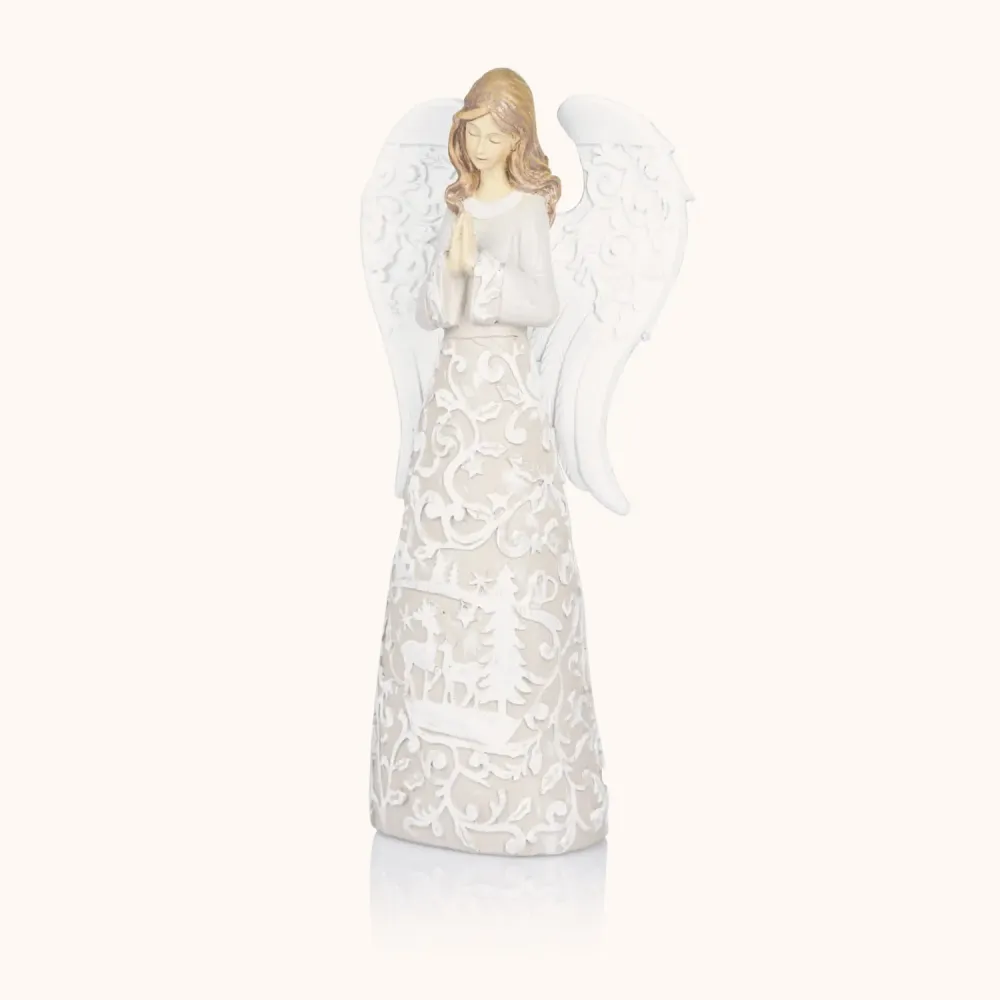 Anielskie figurki o wysokości 23 cm zachwycają delikatnością i subtelnym, świątecznym blaskiem. Trzy warianty – z gołębiem, w modlitwie lub ze śnieżynką – to elegancka dekoracja i duchowy akcent, który wnosi do wnętrza pokój i światło Bożego Narodzenia.