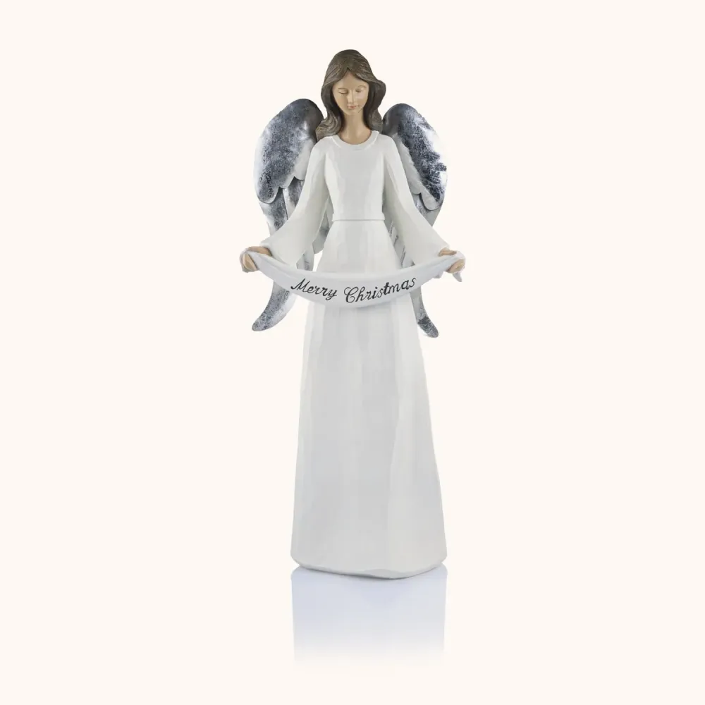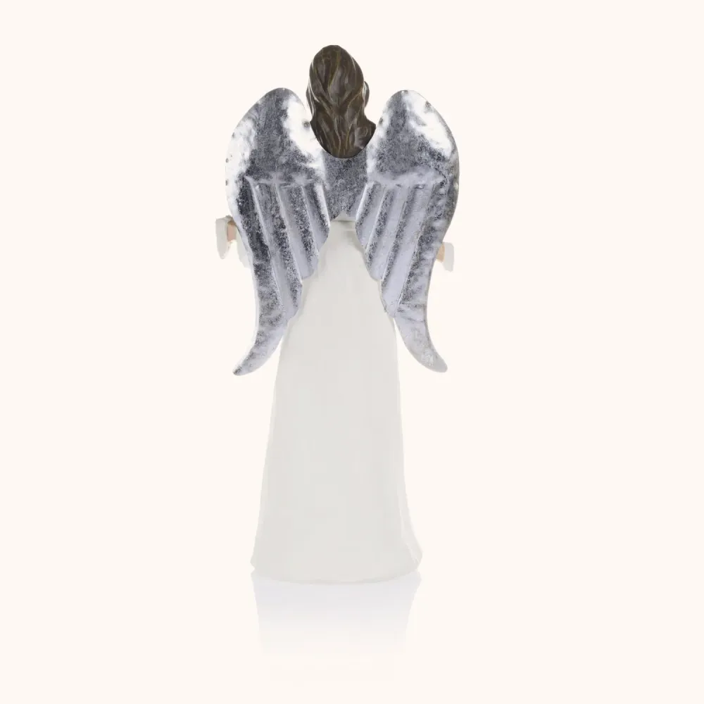 Ubrany w białą szatę z napisem „Merry Christmas” i srebrnymi skrzydłami, wnosi do wnętrza świąteczną radość i elegancję. Idealna do bożonarodzeniowych aranżacji  zarówno domowych, jak i kościelnych.