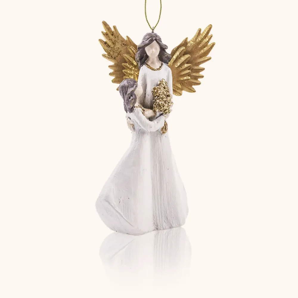 Subtelna figura anioła o złotych skrzydłach symbolizuje opiekę, bezpieczeństwo i czułość.