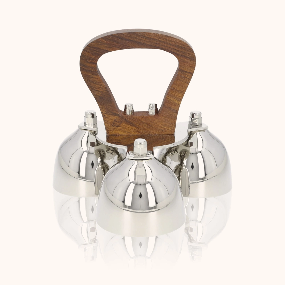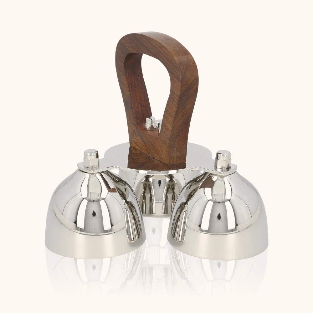 Dzwonki liturgiczne potrójne wykonane z mosiądzu pokrytego niklem, z eleganckim, drewnianym uchwytem. Wydają czysty, donośny dźwięk, który doskonale podkreśla uroczyste momenty liturgii. Wysokość około 13 cm nadaje im elegancji i wygody w użytkowaniu.