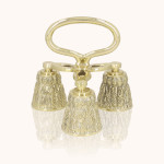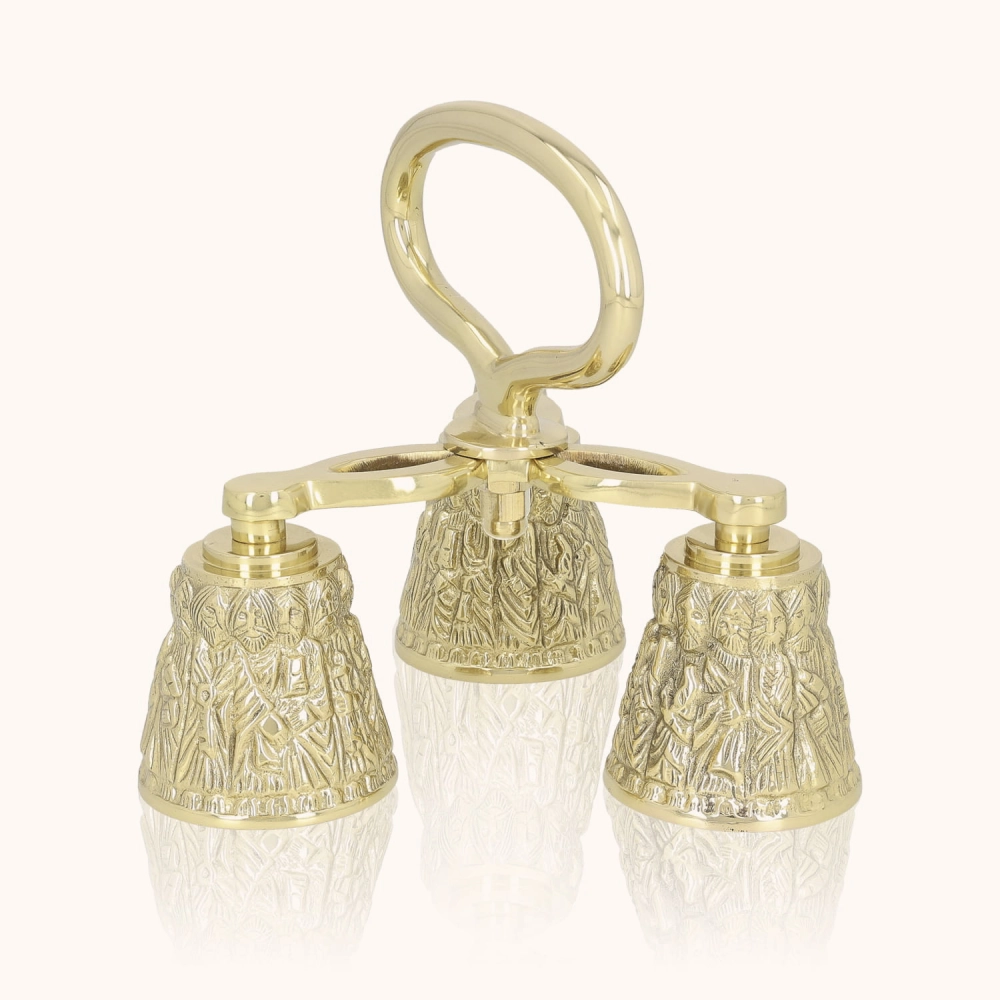 Dzwonki liturgiczne potrójne wykonane z polerowanego mosiądzu, ozdobione misternym, tłoczonym wzorem. Wydają czysty i harmonijny dźwięk, idealny do uroczystych celebracji. Wysokość około 15 cm nadaje im elegancki wygląd i wygodę w użytkowaniu.