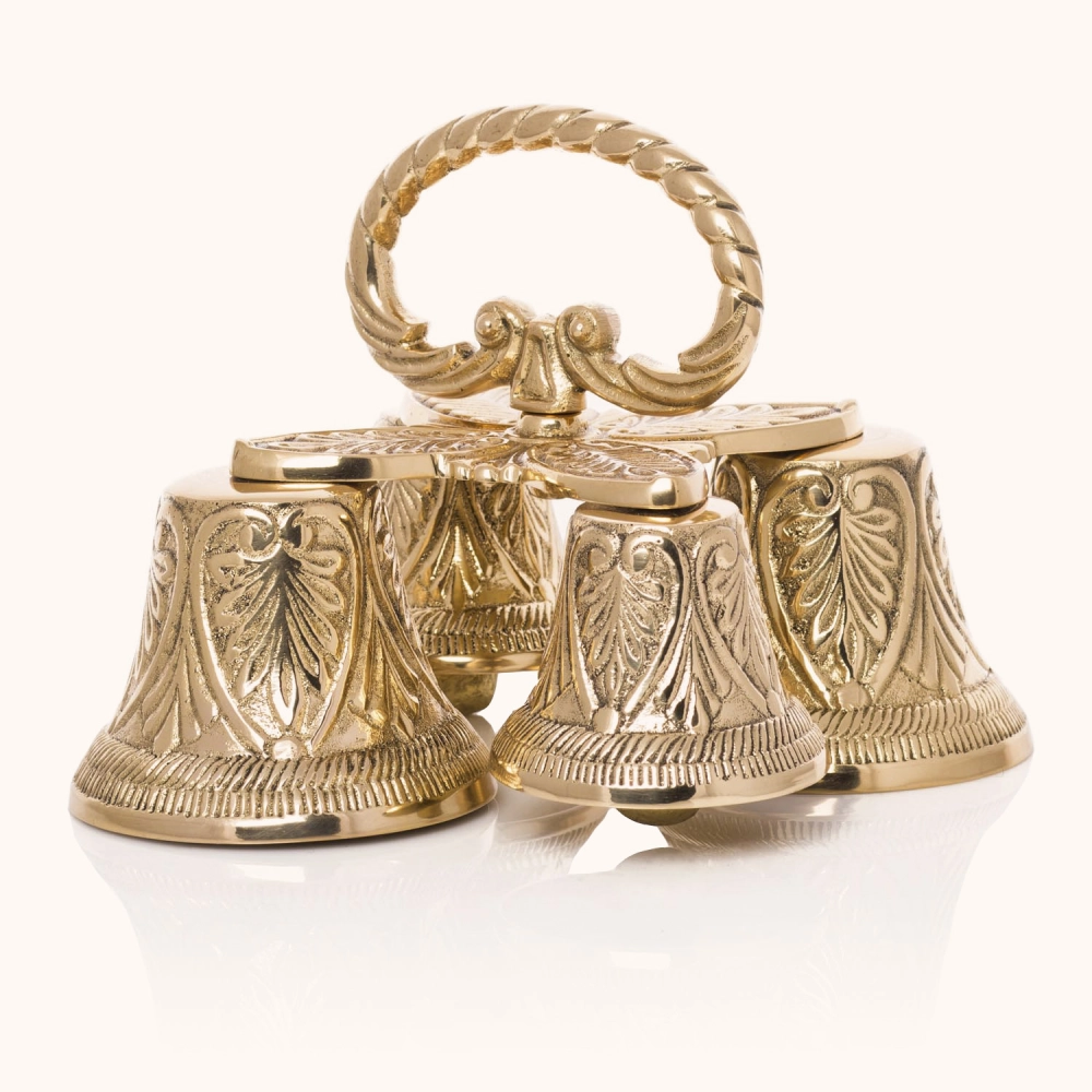 Dzwonki liturgiczne poczwórne wykonane z polerowanego mosiądzu, ozdobione eleganckim, tłoczonym wzorem. Wydają czysty, harmonijny dźwięk, który podkreśla uroczysty charakter celebracji. Wysokość około 17 cm nadaje im klasycznego wyglądu i wygody w użytkowaniu.