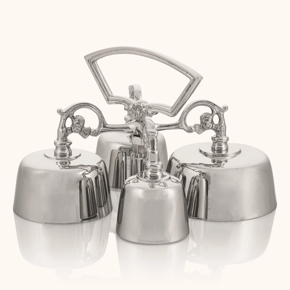 Dzwonki liturgiczne poczwórne wykonane z mosiądzu pokrytego niklem, o eleganckim, srebrzystym połysku. Wydają czysty i dźwięczny ton, doskonały do użytku podczas liturgii. Wysokość około 12 cm zapewnia wygodę obsługi i estetyczny wygląd na ołtarzu.