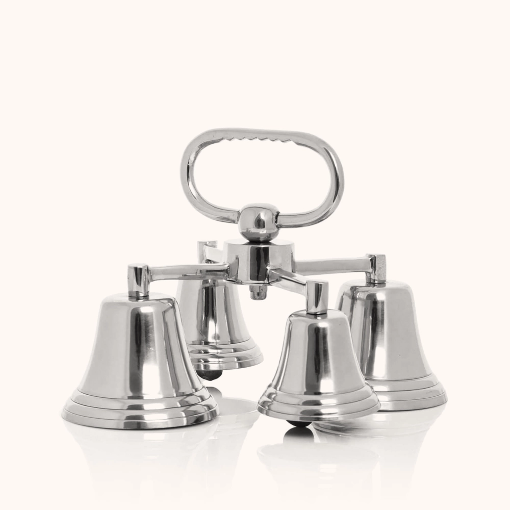 Dzwonki liturgiczne poczwórne wykonane z mosiądzu pokrytego niklem, o eleganckim, srebrzystym połysku. Wydają czysty, donośny dźwięk, idealny do podkreślenia uroczystych momentów liturgii. Wysokość około 16 cm zapewnia wygodę i estetyczny wygląd na ołtarzu.