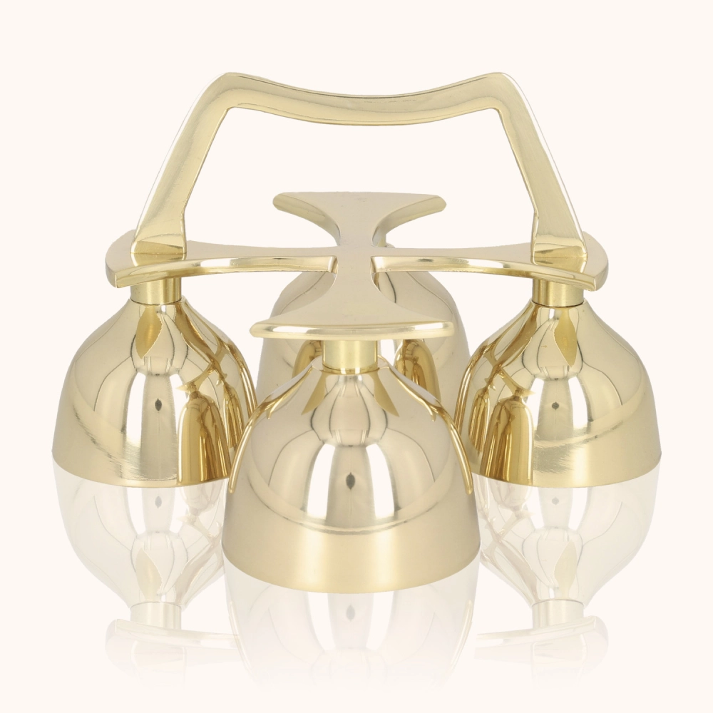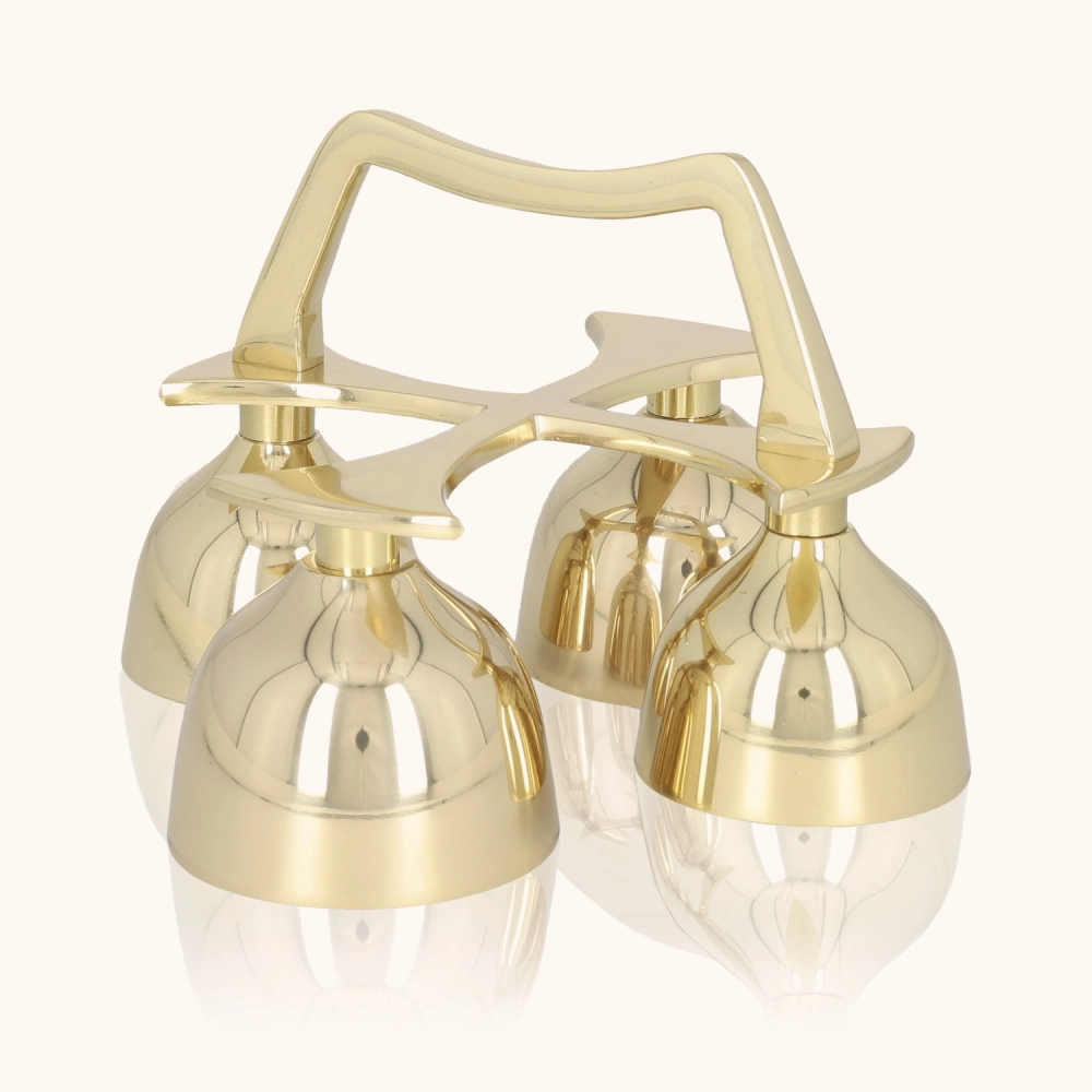 Dzwonki liturgiczne poczwórne wykonane z polerowanego mosiądzu, o eleganckim, klasycznym kształcie. Czyste i donośne brzmienie podkreśla uroczysty charakter liturgii. Wysokość około 10 cm sprawia, że są poręczne i doskonale prezentują się na ołtarzu.