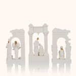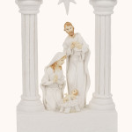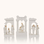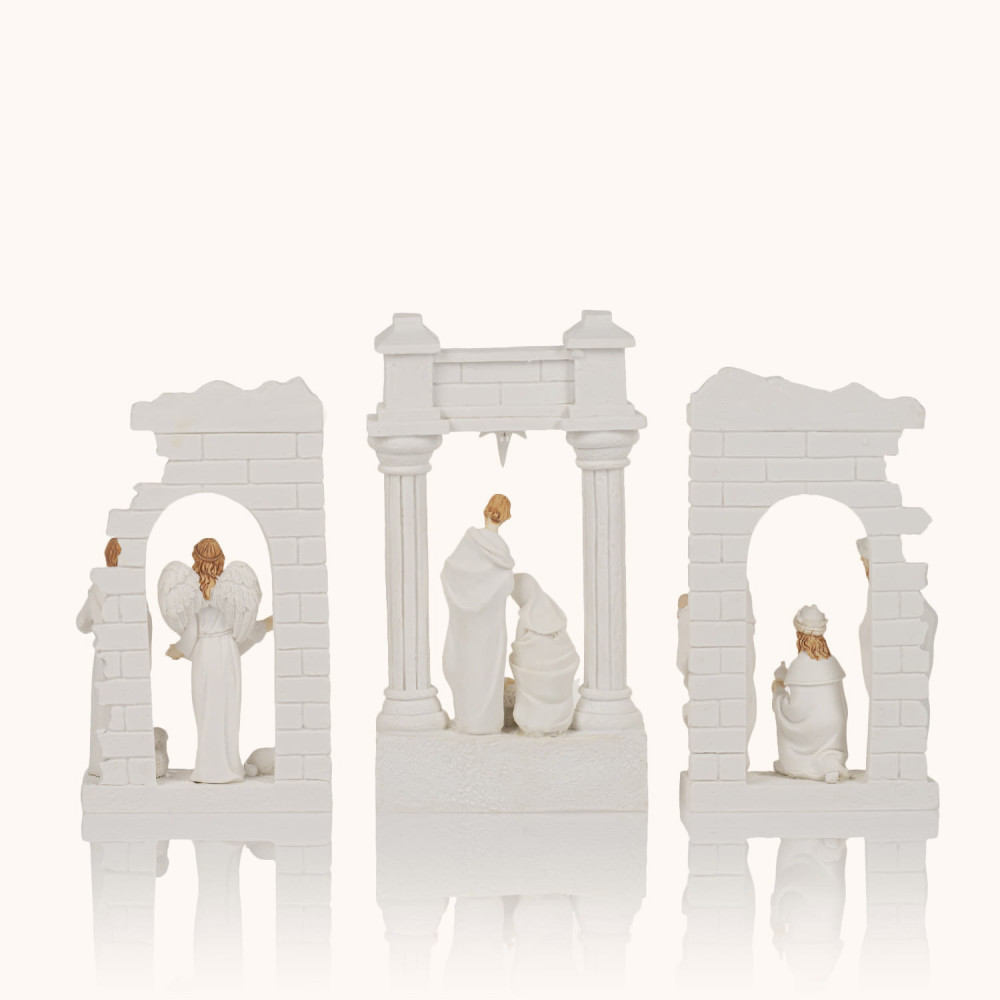 Szopka bożonarodzeniowa w odcieniu bieli, rozświetlona ciepłym światłem, które podkreśla spokój i delikatność sceny Narodzenia. Trzy połączone arkady tworzą harmonijną całość o wysokości około 16 cm – elegancką ozdobę pełną ciszy i blasku Świąt.