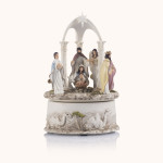 Szopka bożonarodzeniowa z pozytywką i delikatnym światłem, w tonacji bieli i złamanych pasteli. Gdy melodia rozbrzmiewa, scena Narodzenia nabiera czułości i blasku. Wysokość około 17 cm – mała forma, która niesie wielkie wzruszenie.
