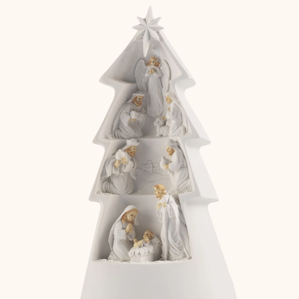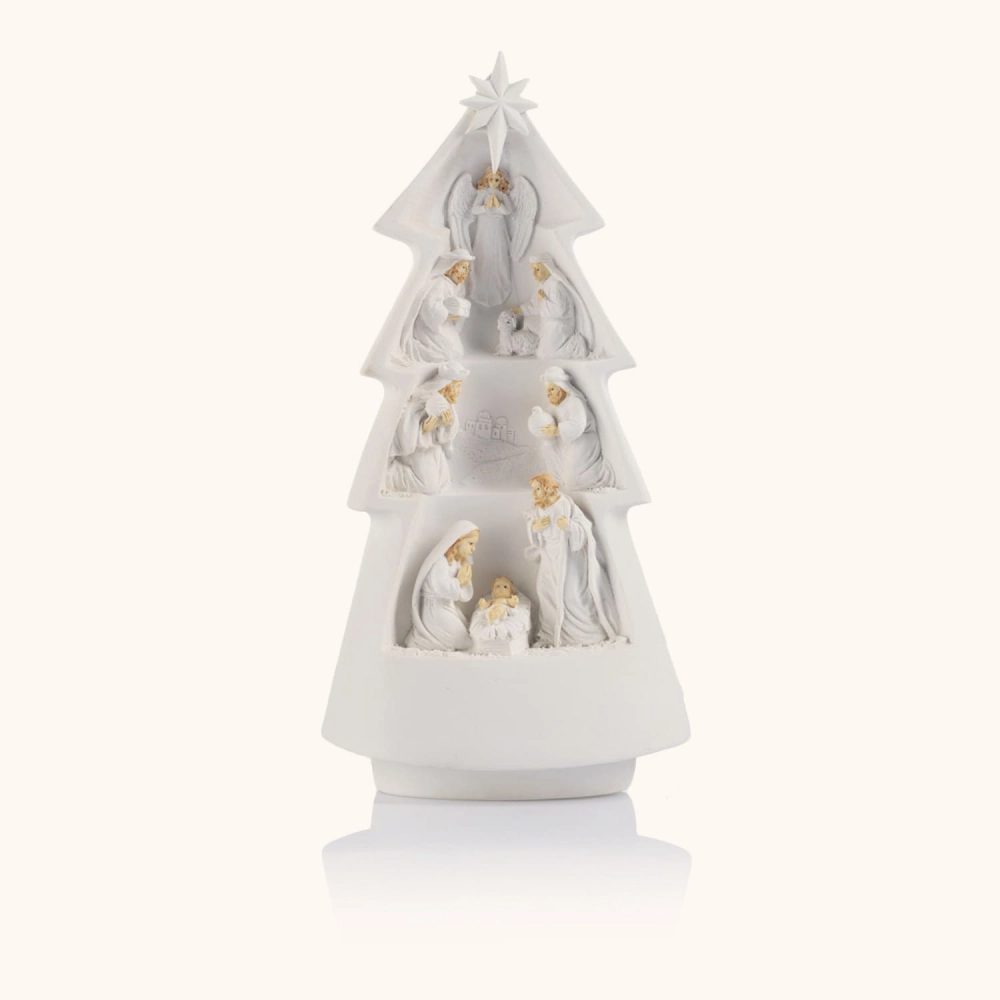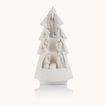 Szopka bożonarodzeniowa w formie choinki, w odcieniu bieli z delikatnym światłem przenikającym przez scenę Narodzenia. Subtelna i elegancka, wnosi ciepło i spokój Świąt. Wysokość około 19 cm – drobna, lecz pełna blasku.