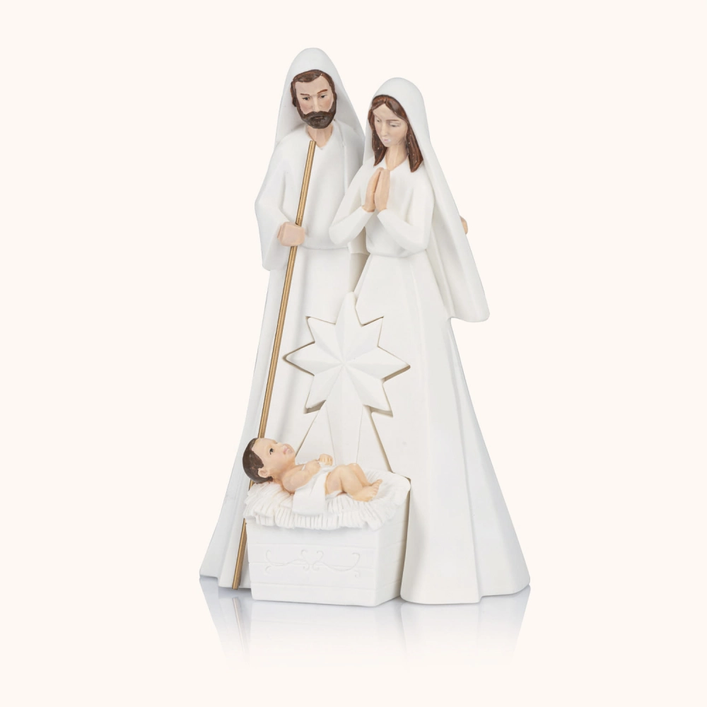Subtelna figurka modułowej Świętej Rodziny to świetlisty akcent Bożego Narodzenia. W białej tonacji z delikatnymi złoceniami, niesie spokój i modlitewną obecność. Dzięki wbudowanemu oświetleniu staje się symbolem światła, które przyszło na świat. Idealna do postawienia na ołtarzyku, komodzie lub wśród świątecznych dekoracji.