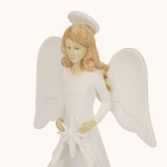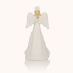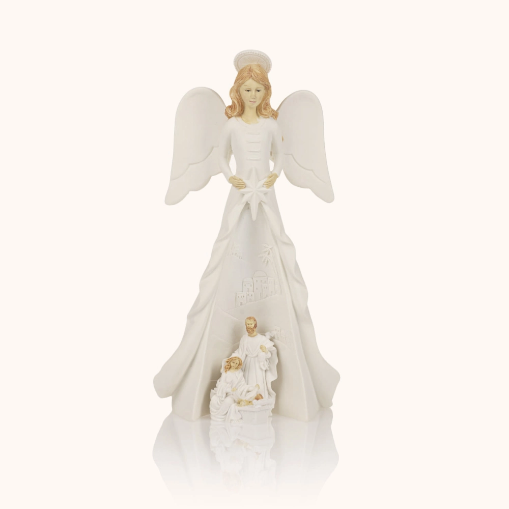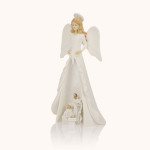 Figurka anioła otaczającego opieką Świętą Rodzinę, rozświetlona delikatnym, ciepłym światłem. Utrzymana w odcieniach bieli i złota, emanuje spokojem i czystością. Wysokość około 19 cm podkreśla jej subtelną elegancję i duchowy charakter.