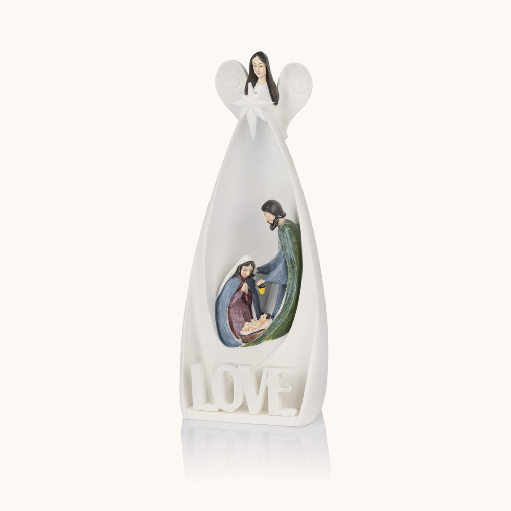Figurka anioła ze Świętą Rodziną, ozdobiona napisem LOVE i delikatnym podświetleniem. Utrzymana w odcieniach bieli, emanuje spokojem i ciepłem. Wysokość około 20 cm podkreśla jej elegancki charakter, czyniąc z niej subtelną ozdobę pełną miłości i światła.
