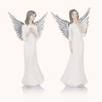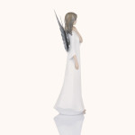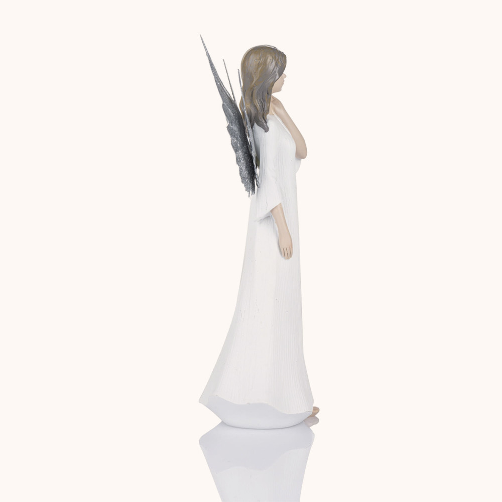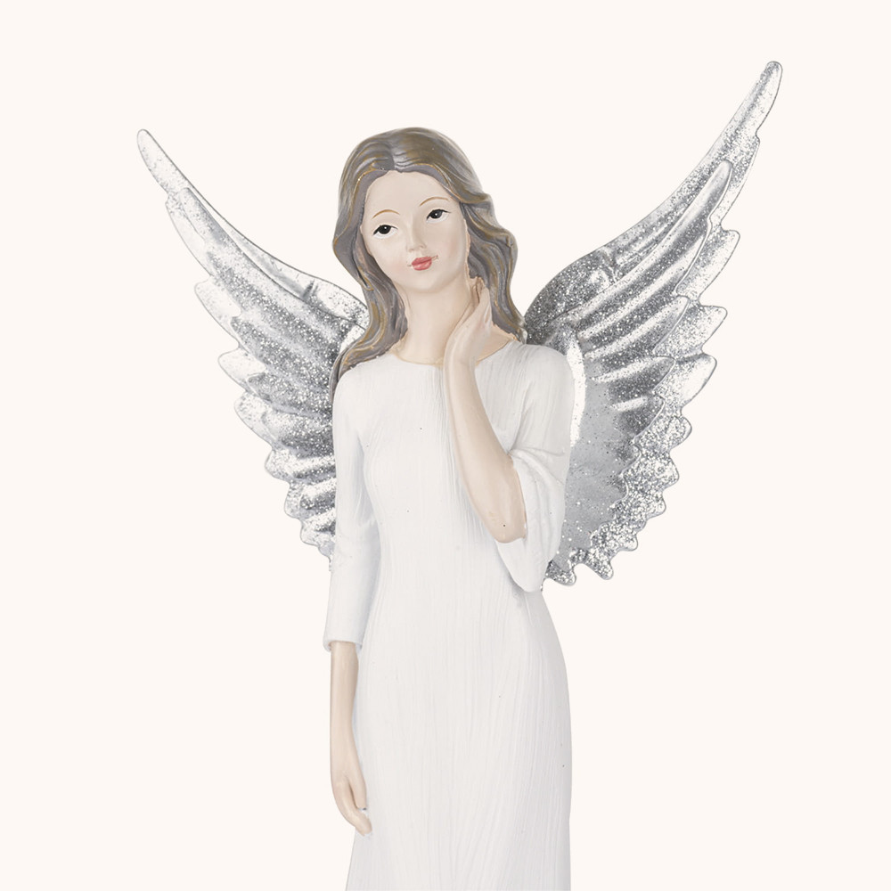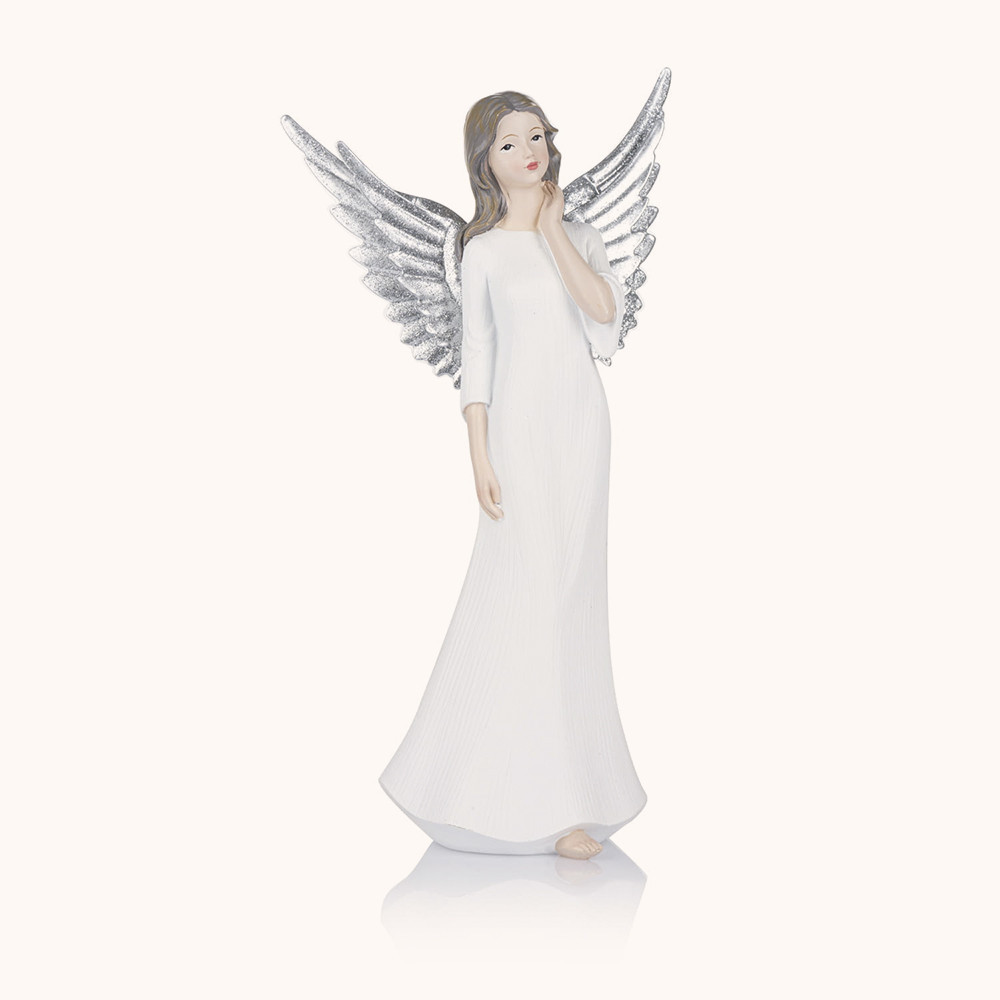 Subtelna figurka anioła o wysokości 30 cm w białej szacie i ze srebrzystymi skrzydłami.
