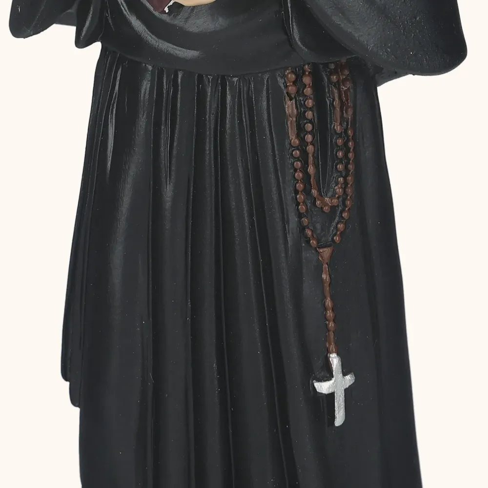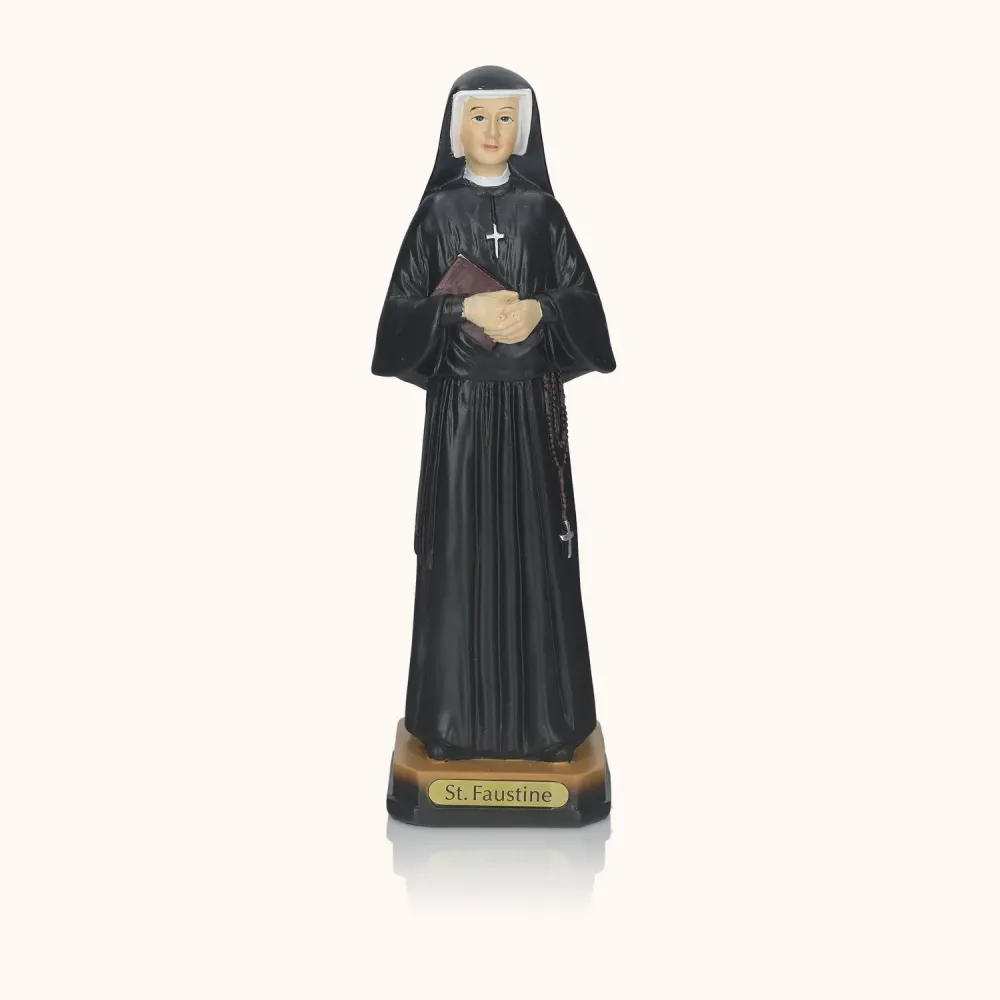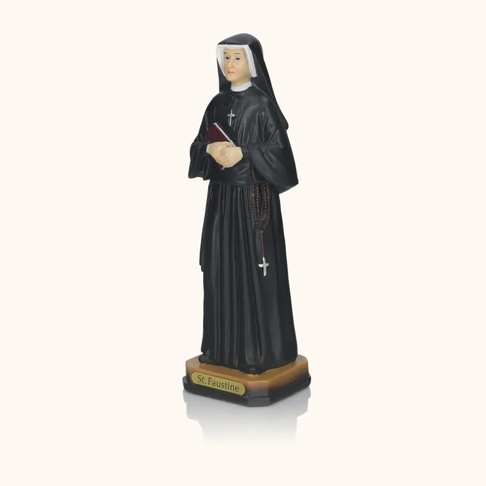 Figurka Świętej Faustyny o wysokości 20 cm przedstawia Apostołkę Bożego Miłosierdzia w czarnym habicie z różańcem i dzienniczkiem. Prosty, ale głęboko symboliczny wizerunek idealny do codziennej modlitwy, domowego ołtarzyka lub jako pamiątka duchowej opieki.