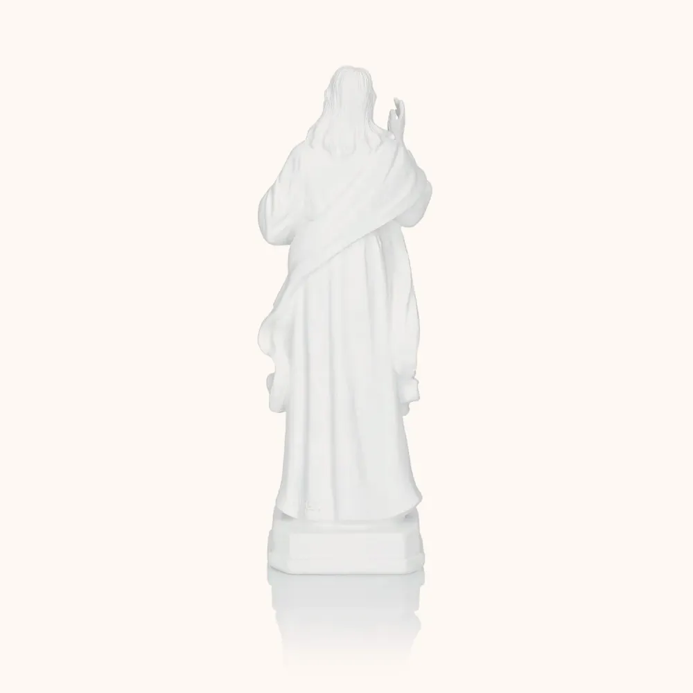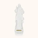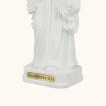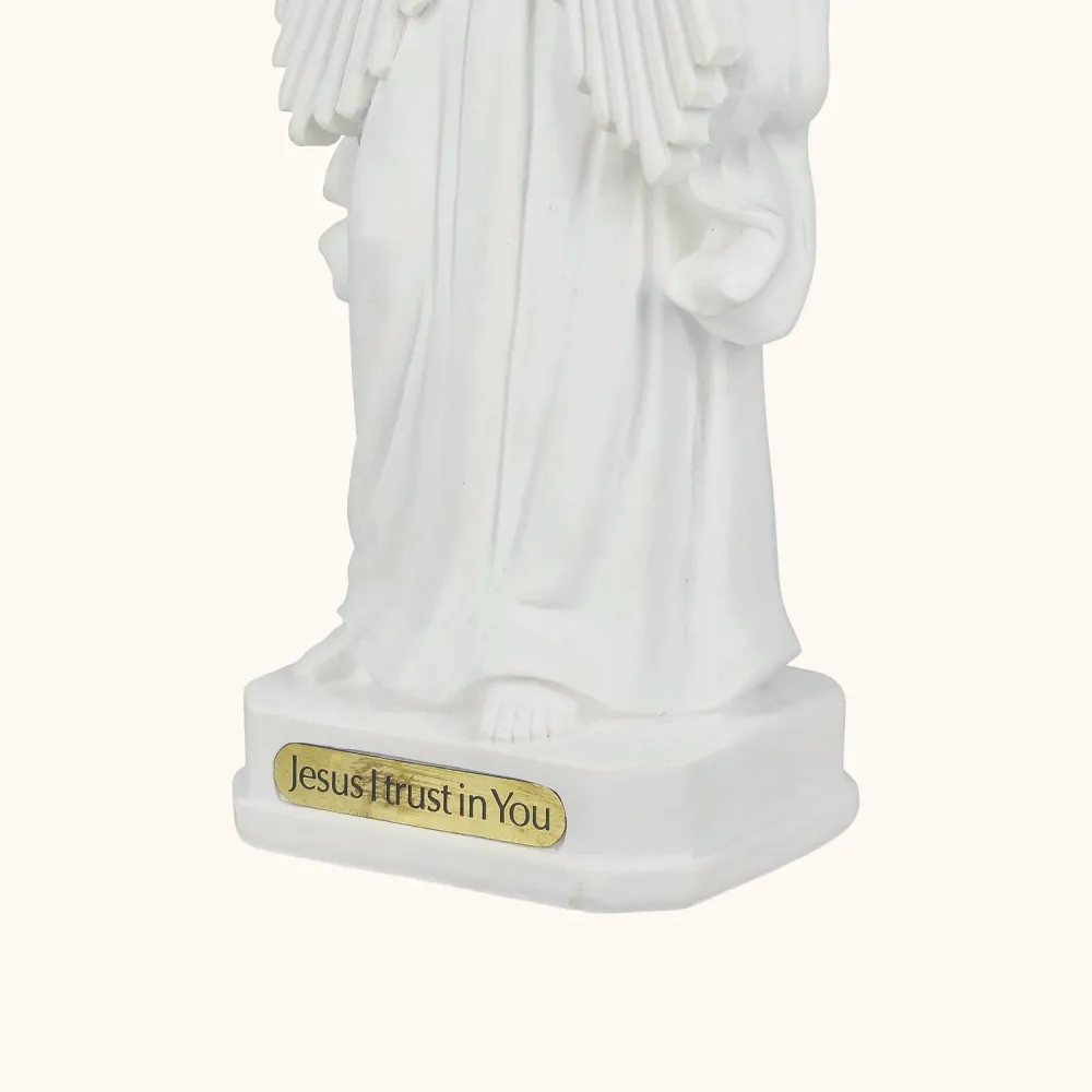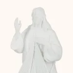 Subtelna figura Jezusa Miłosiernego, wykonana z jasnej żywicy, ukazuje Chrystusa z podniesioną dłonią w geście błogosławieństwa i promieniami miłosierdzia wypływającymi z Jego serca - symbolem przebaczenia i Bożej łaski. Biała kolorystyka podkreśla czystość i duchowy charakter figury, czyniąc ją idealnym elementem modlitewnego kącika lub wyjątkowym prezentem. Wysokość 20 cm pozwala na łatwe ustawienie jej w domu, kapliczce lub miejscu codziennej modlitwy.
