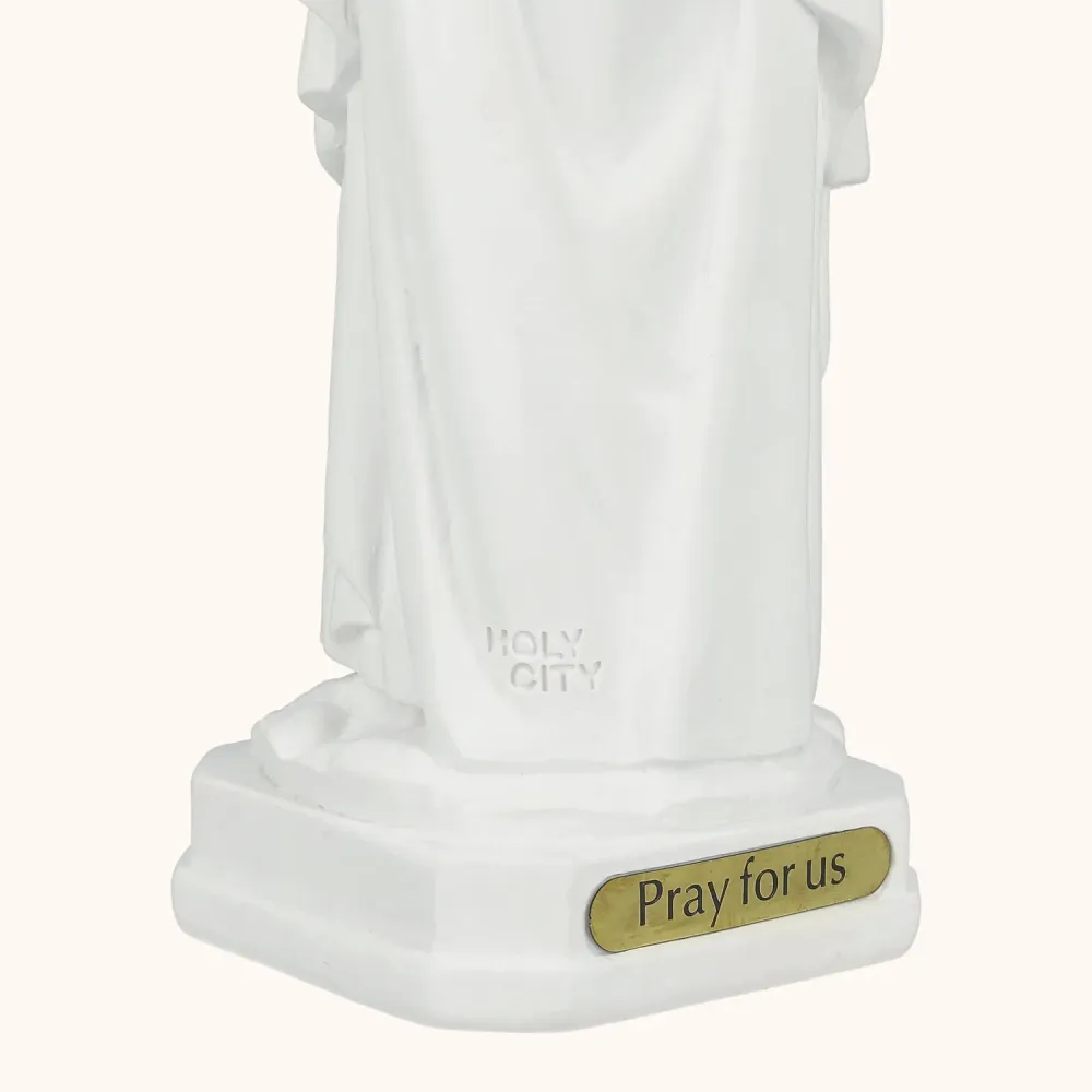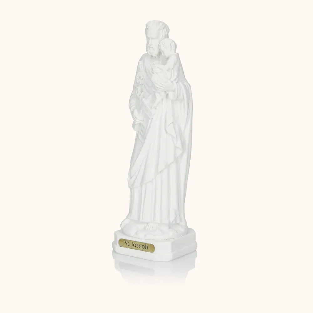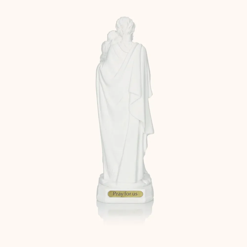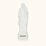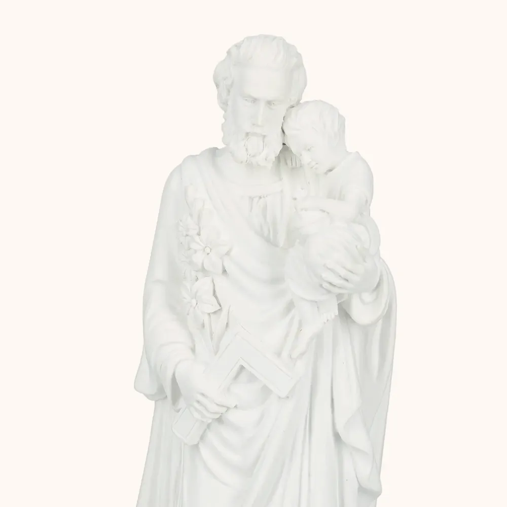Subtelna figurka Św. Józefa o wysokości 20 cm, wykonana z jasnej żywicy, ukazuje Opiekuna Świętej Rodziny w czułym geście troski, z Dzieciątkiem Jezus na rękach i lilią - symbolem czystości. Precyzyjnie odwzorowane detale i delikatna biel tworzą spokojną, duchową atmosferę. Idealna do postawienia w domu, gabinecie lub miejscu modlitwy jako wyraz zawierzenia i opieki ojcowskiej.
