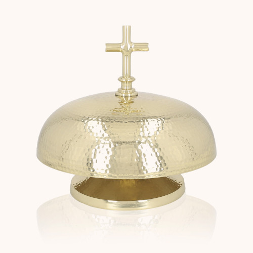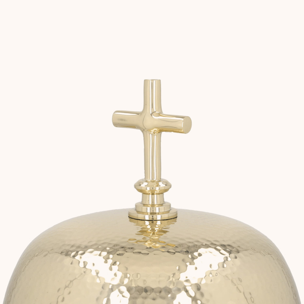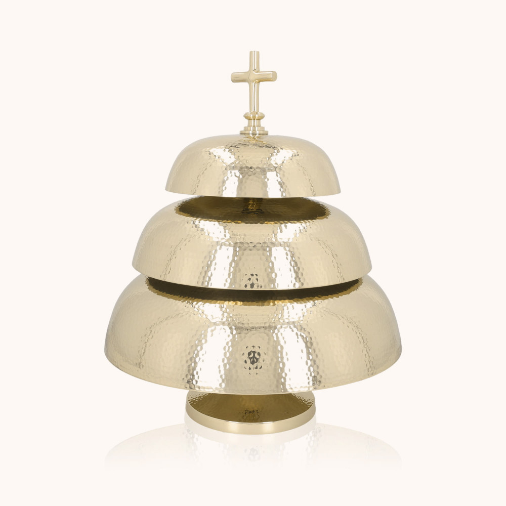 Gong liturgiczny trójtonowy wykonany z polerowanego mosiądzu, z drewnianym młotkiem w zestawie. Trzy dzwony o różnych tonacjach tworzą głęboki, harmonijny dźwięk. Wysokość około 40 cm nadaje mu elegancji i podniosłego charakteru, idealnego do uroczystych celebracji liturgicznych.