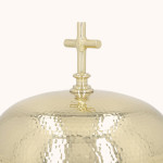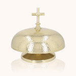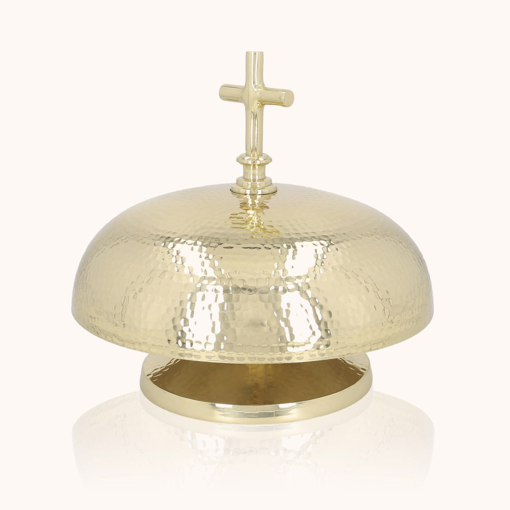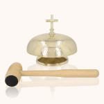 Gong liturgiczny pojedynczy wykonany z polerowanego mosiądzu, z krzyżem umieszczonym na szczycie. W zestawie znajduje się drewniany młotek. Średnica około 20 cm zapewnia czysty, donośny dźwięk, idealny do podkreślenia uroczystych momentów liturgii.