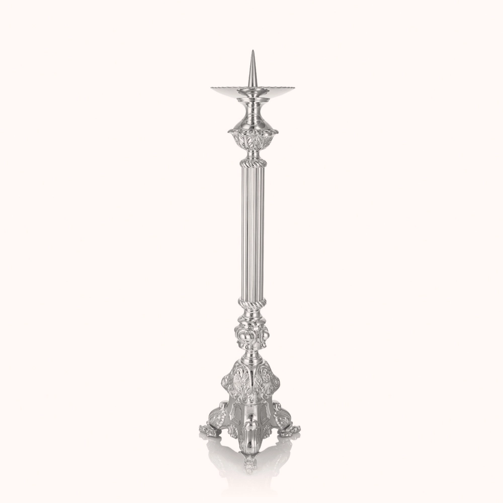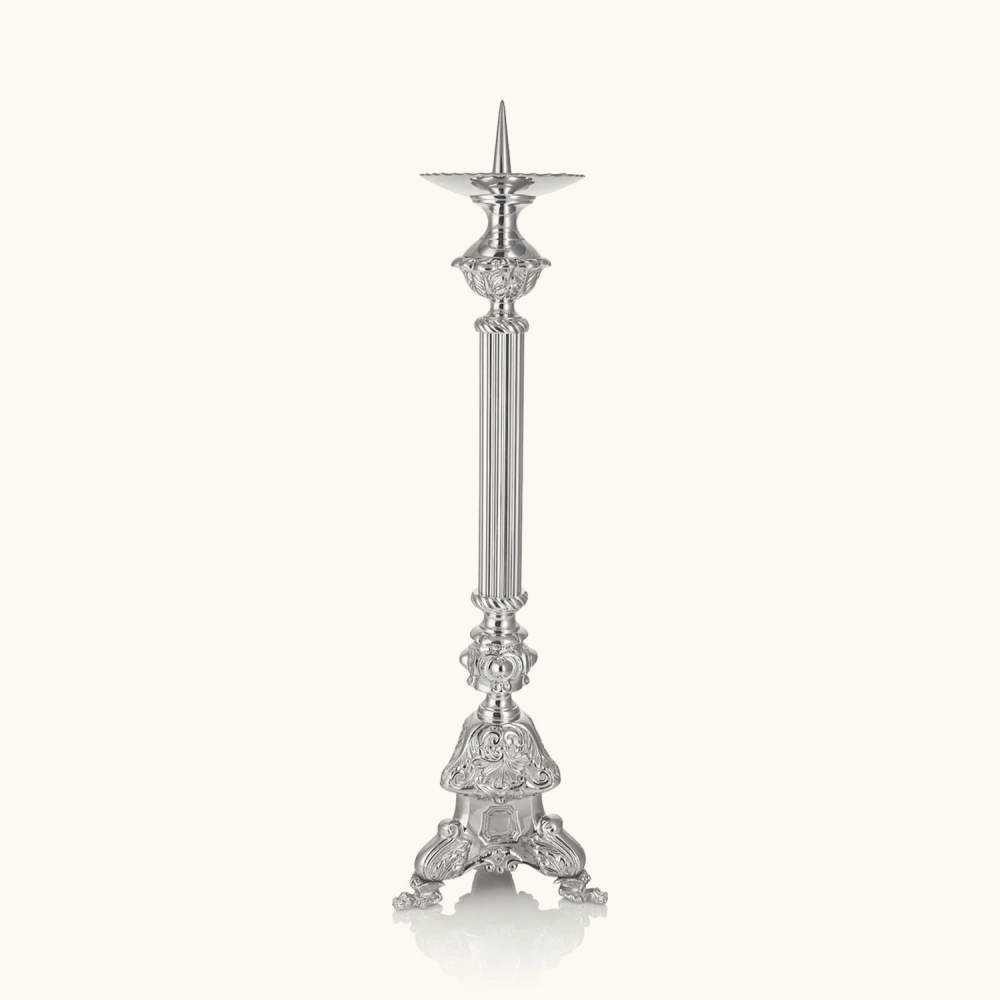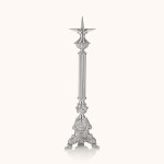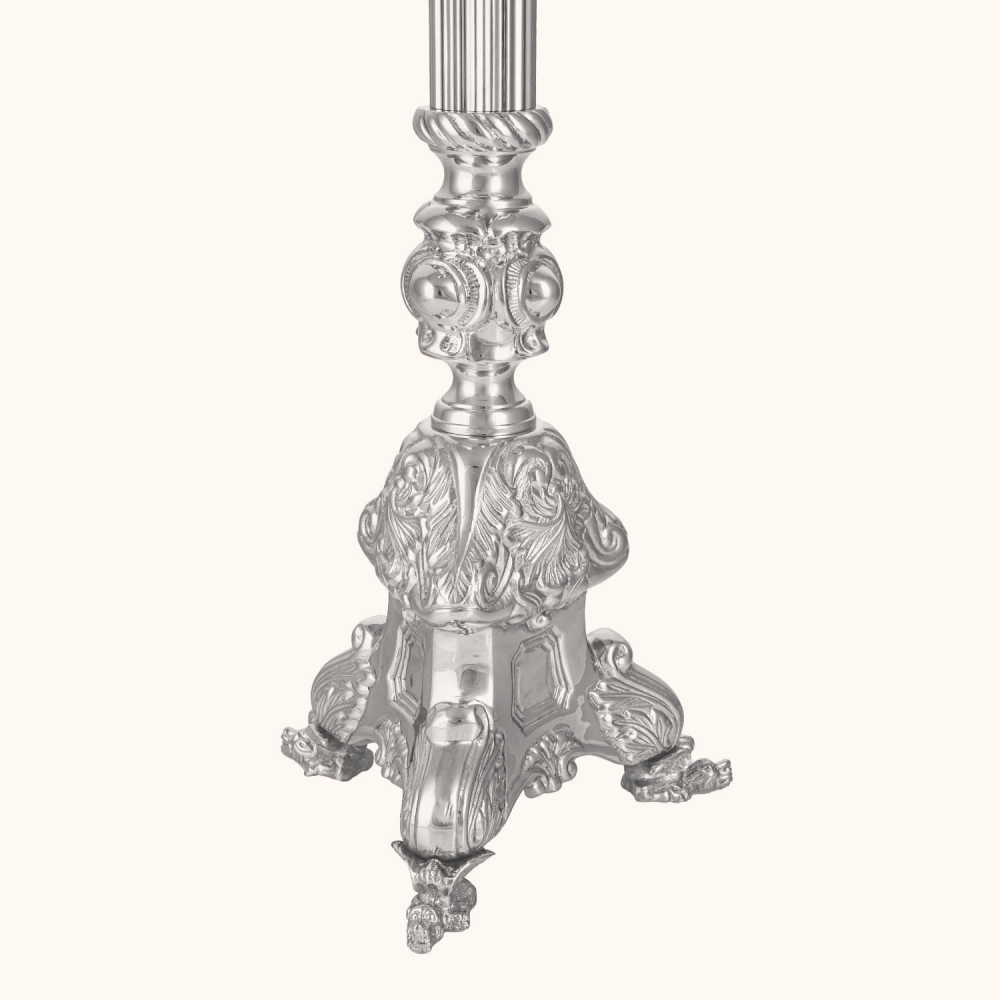 Lichtarz wykonany z mosiądzu pokrytego niklem, o wysokości 61 cm. Elegancki model o zdobionej podstawie i smukłej formie. Trwały i stabilny, idealny do użytku liturgicznego.