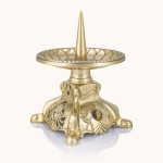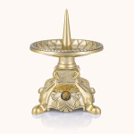 Lichtarz wykonany z mosiądzu, o wysokości 11 cm. Ozdobiony kamieniami – malachitem i tygrysim okiem. Posiada szpic do świecy i stabilną podstawę. Trwały i dekoracyjny, idealny do użytku w kościele lub kaplicy.