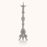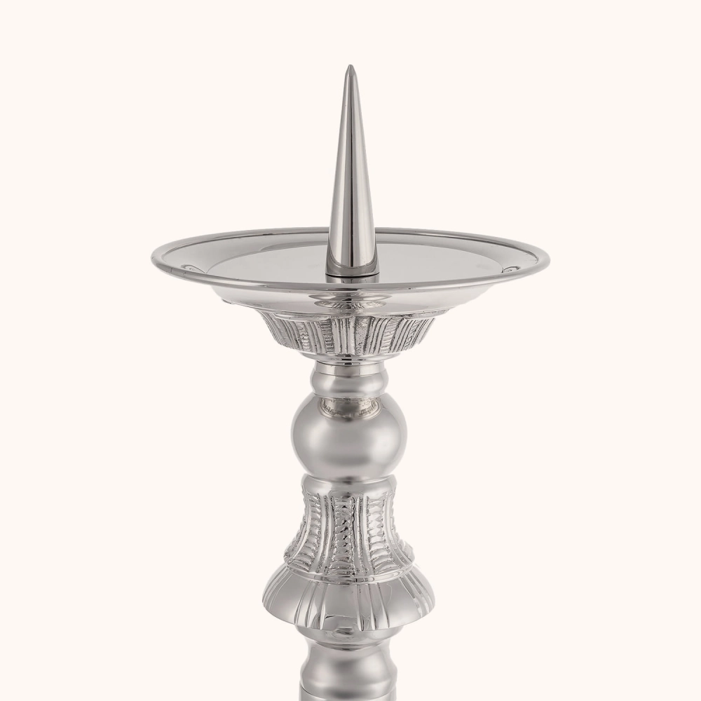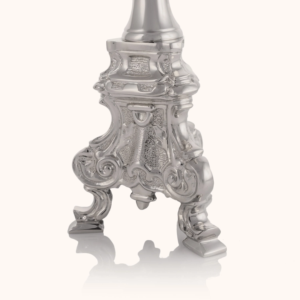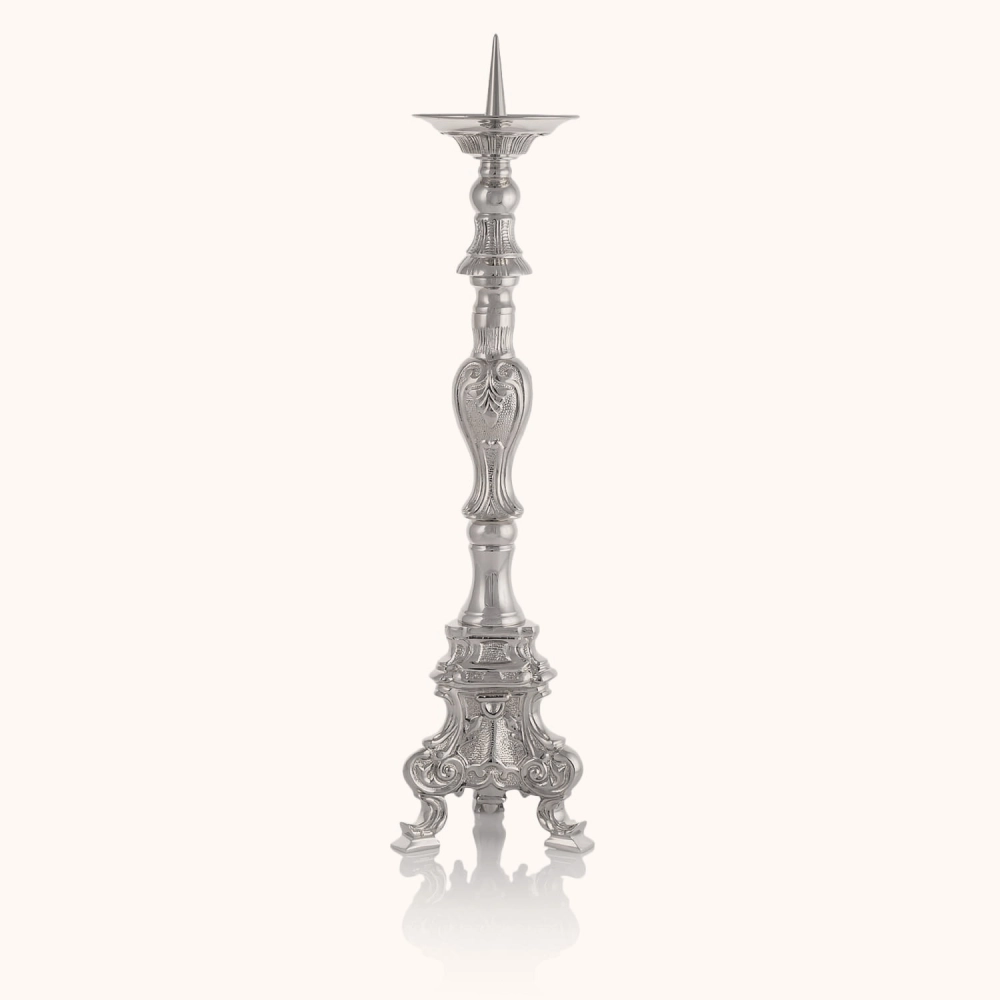 Lichtarz wykonany z mosiądzu pokrytego niklem, o wysokości 70 cm. Bogato zdobiony model ze szpicem do świecy i stabilną, rzeźbioną podstawą. Trwały i elegancki, przeznaczony do użytku na ołtarzu lub w kaplicy.