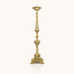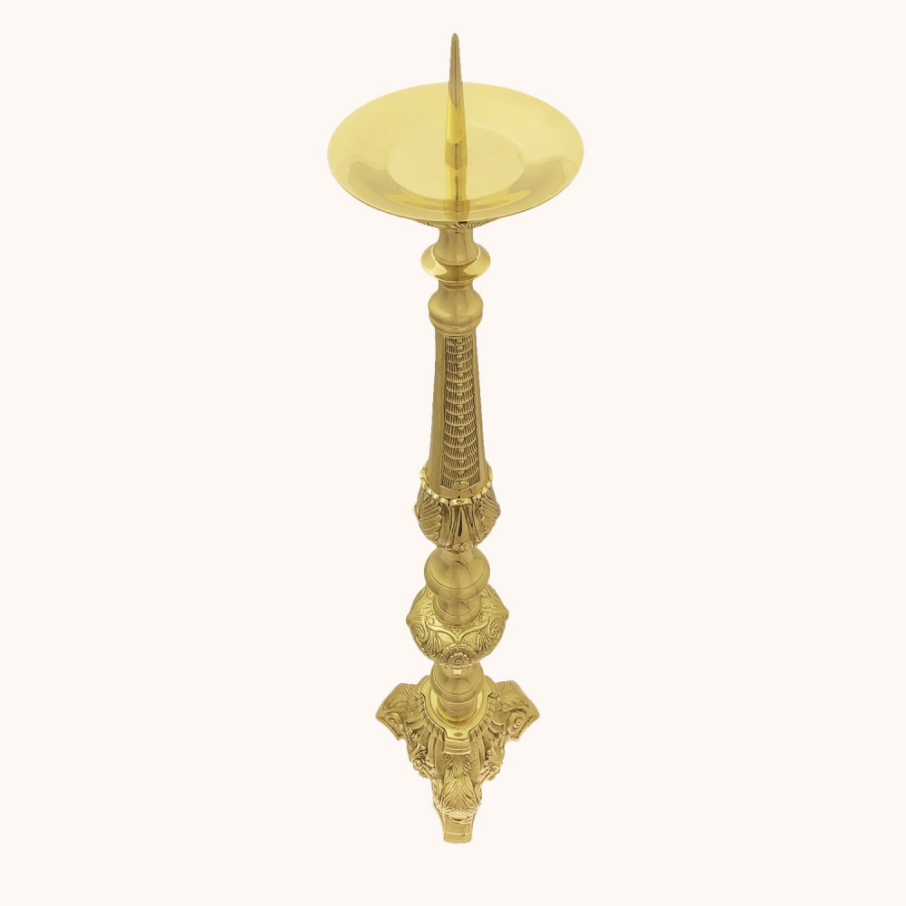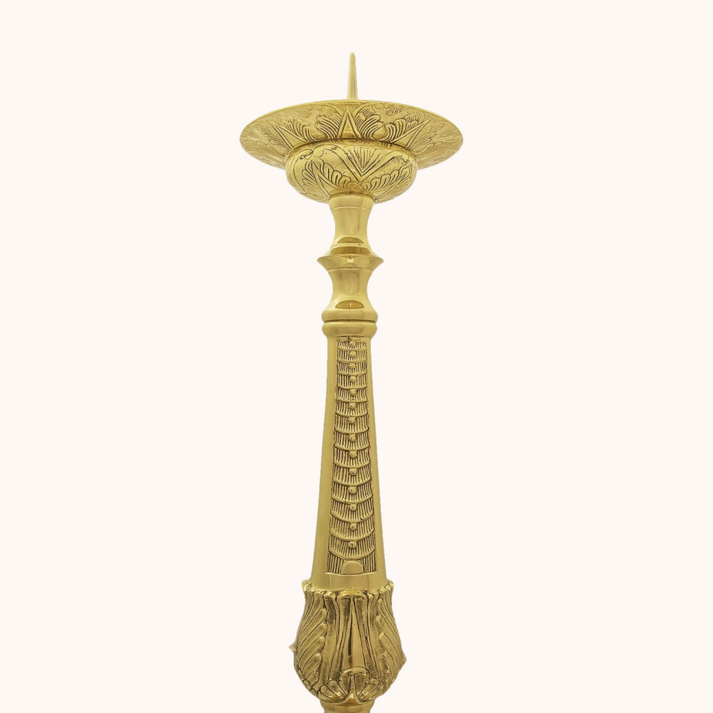 Lichtarz wykonany z mosiądzu, o wysokości 100 cm. Imponujący, bogato zdobiony model ze szpicem do świecy i rzeźbioną podstawą. Stabilny i trwały, przeznaczony do użytku liturgicznego w kościołach i katedrach.