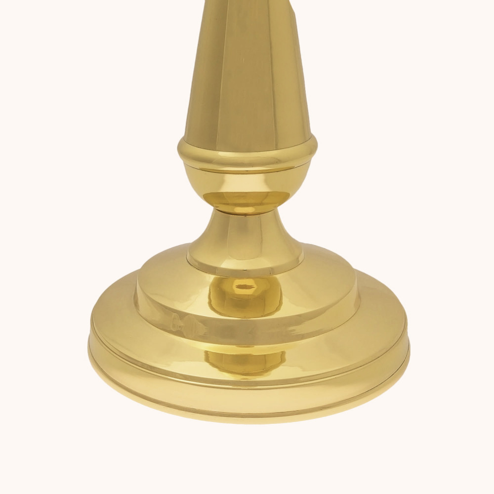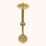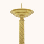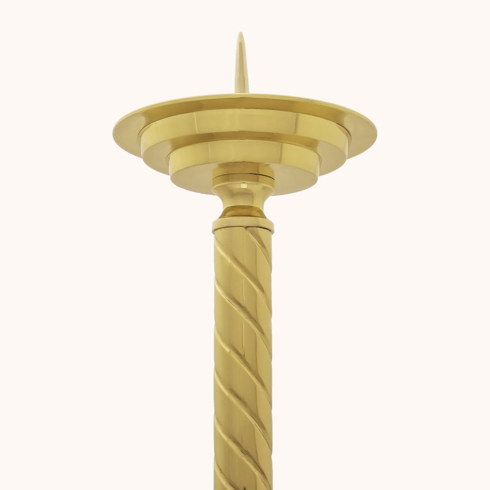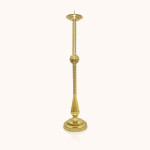 Lichtarz wykonany z mosiądzu, o wysokości 97 cm. Smukły model z ozdobnym trzonem, szpicem do świecy i szeroką, stabilną podstawą. Trwały i elegancki, przeznaczony do użytku liturgicznego w kościołach i kaplicach.