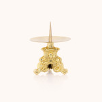 Lichtarz wykonany z mosiądzu, o wysokości 8 cm. Niski, ozdobny model ze szpicem do świecy i dekoracyjną podstawą z motywem anioła. Stabilny i solidny, idealny do użytku liturgicznego lub jako element wystroju ołtarza.