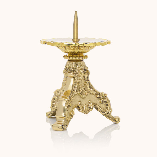 Lichtarz wykonany z odlewu mosiężnego, o wysokości 4 cm (bez szpica). Szerokość podstawy 9,5 cm i średnica miejsca pod świecę 9 cm zapewniają odpowiednią stabilność. Podstawa dekorowana jest ryflowaniem oraz pierścieniem z drobnymi kulkami, co nadaje jej elegancki i tradycyjny charakter. Gładka misa pod świecę harmonijnie łączy się z delikatnie stożkowatym trzonem.