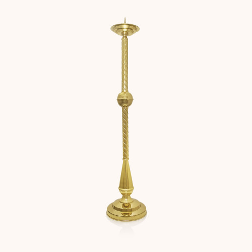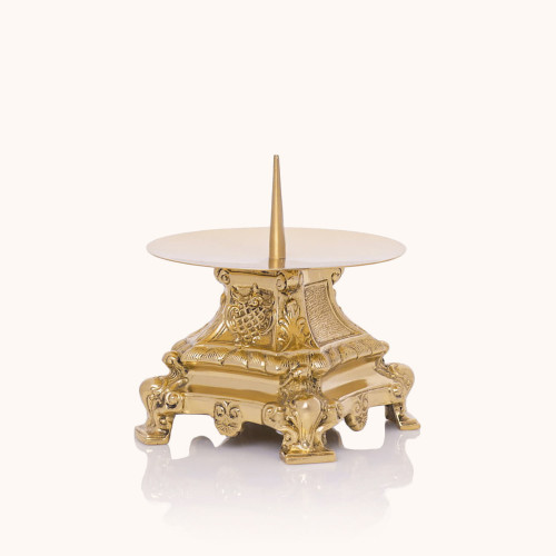 Lichtarz wykonany z odlewu mosiężnego, o wysokości 2 cm (bez szpica). Szerokość podstawy 3,5 cm i średnica miejsca pod świecę 4 cm sprawiają, że model ten doskonale nadaje się do mniejszych świec ołtarzowych. Podstawa w formie rozety o delikatnie falowanym brzegu stanowi ozdobny, ale praktyczny element liturgicznego wyposażenia. Gładka, błyszcząca powierzchnia mosiądzu ułatwia utrzymanie w czystości.