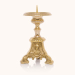 Lichtarz wykonany z odlewu mosiężnego, o wysokości 17 cm (bez szpica). Szerokość podstawy 12 cm i średnica miejsca pod świecę 8,5 cm gwarantują stabilne ustawienie świecy na ołtarzu. Podstawa lichtarza zdobiona jest wizerunkiem Chrystusa, otoczonym misternym ornamentem w stylu klasycznym. Trzon ma elegancką, zaokrągloną formę, a misa pod świecę została wykończona delikatnym żłobieniem.