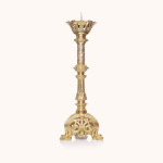 Lichtarz wykonany z odlewu mosiężnego, o wysokości 50 cm (bez szpica). Szerokość podstawy 20 cm i średnica miejsca pod świecę 13 cm zapewniają stabilność i pewne osadzenie świecy ołtarzowej. Całość utrzymana w klasycznym stylu liturgicznym, z licznymi ornamentami i precyzyjnym wykończeniem. Podstawa zdobiona jest motywami roślinnymi i stylizowanymi łukami, a misa pod świecę ma ażurowy rant, który podkreśla reprezentacyjny charakter lichtarza.